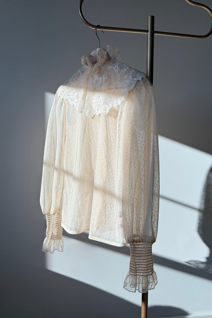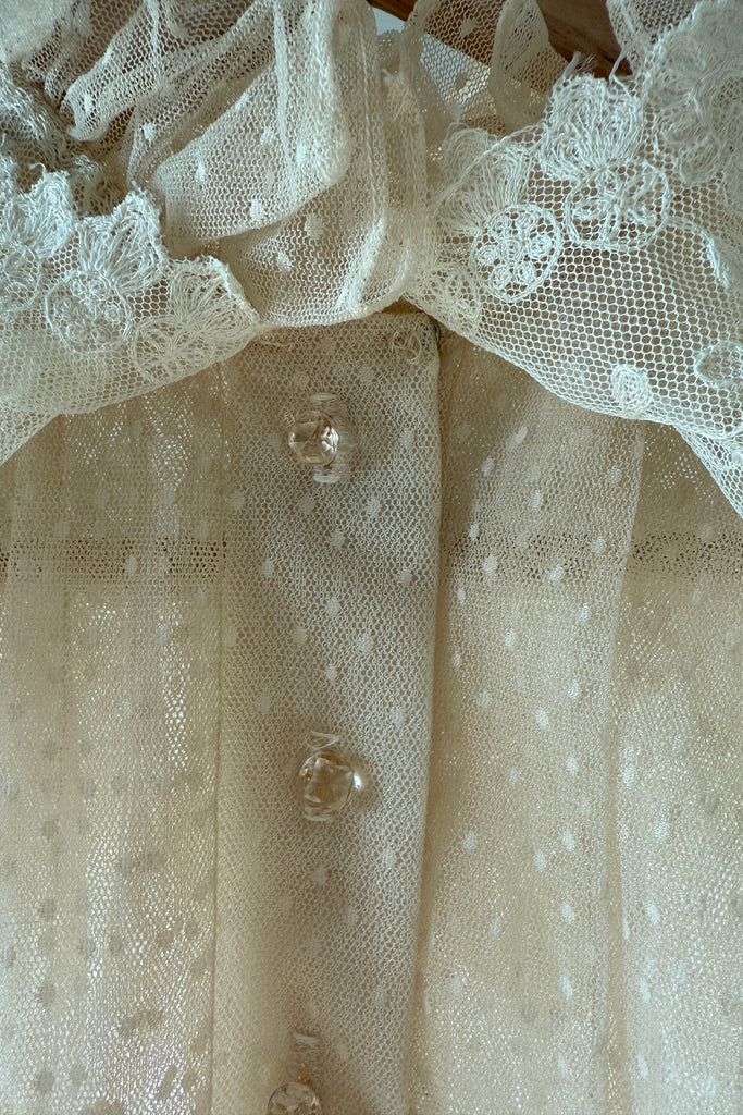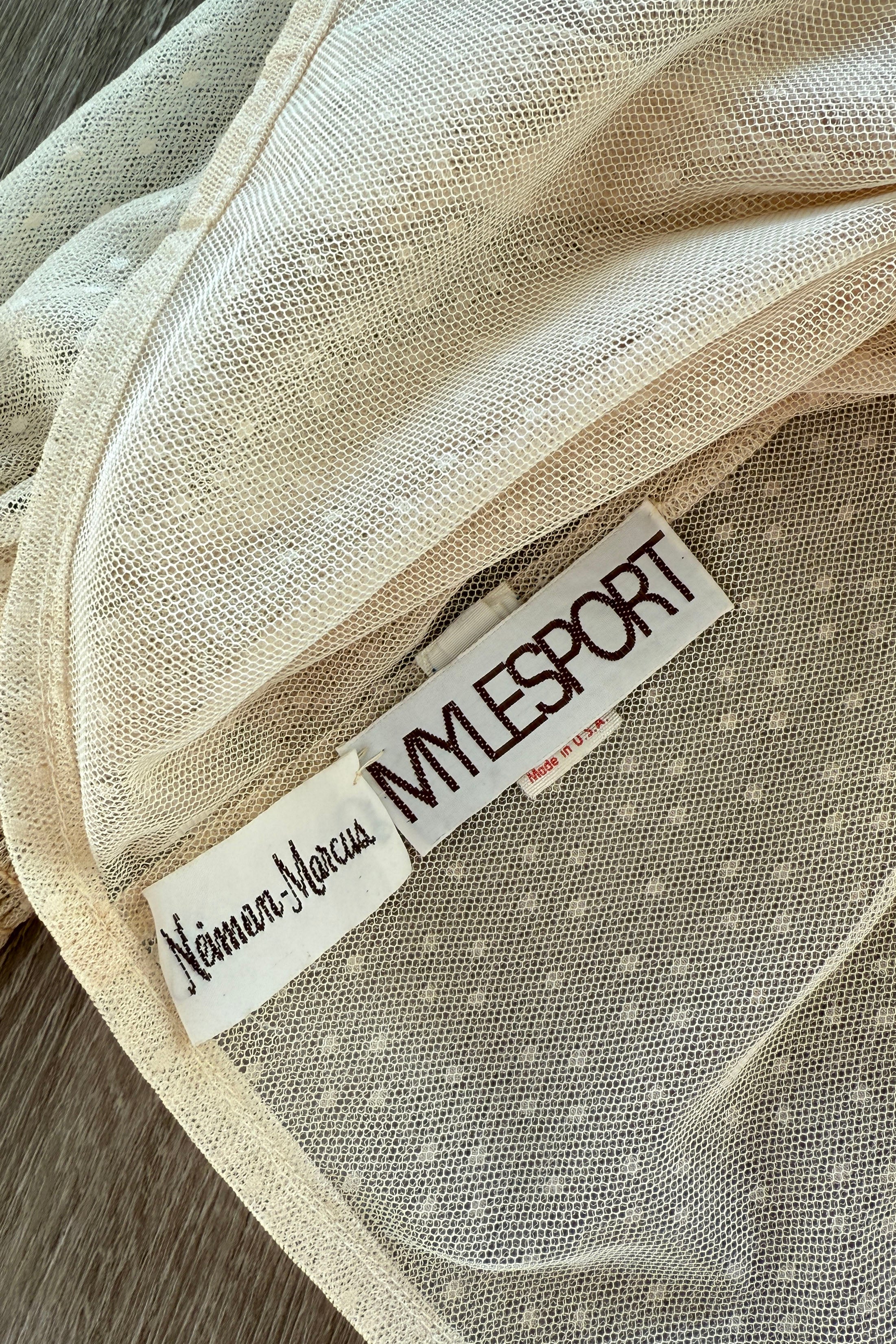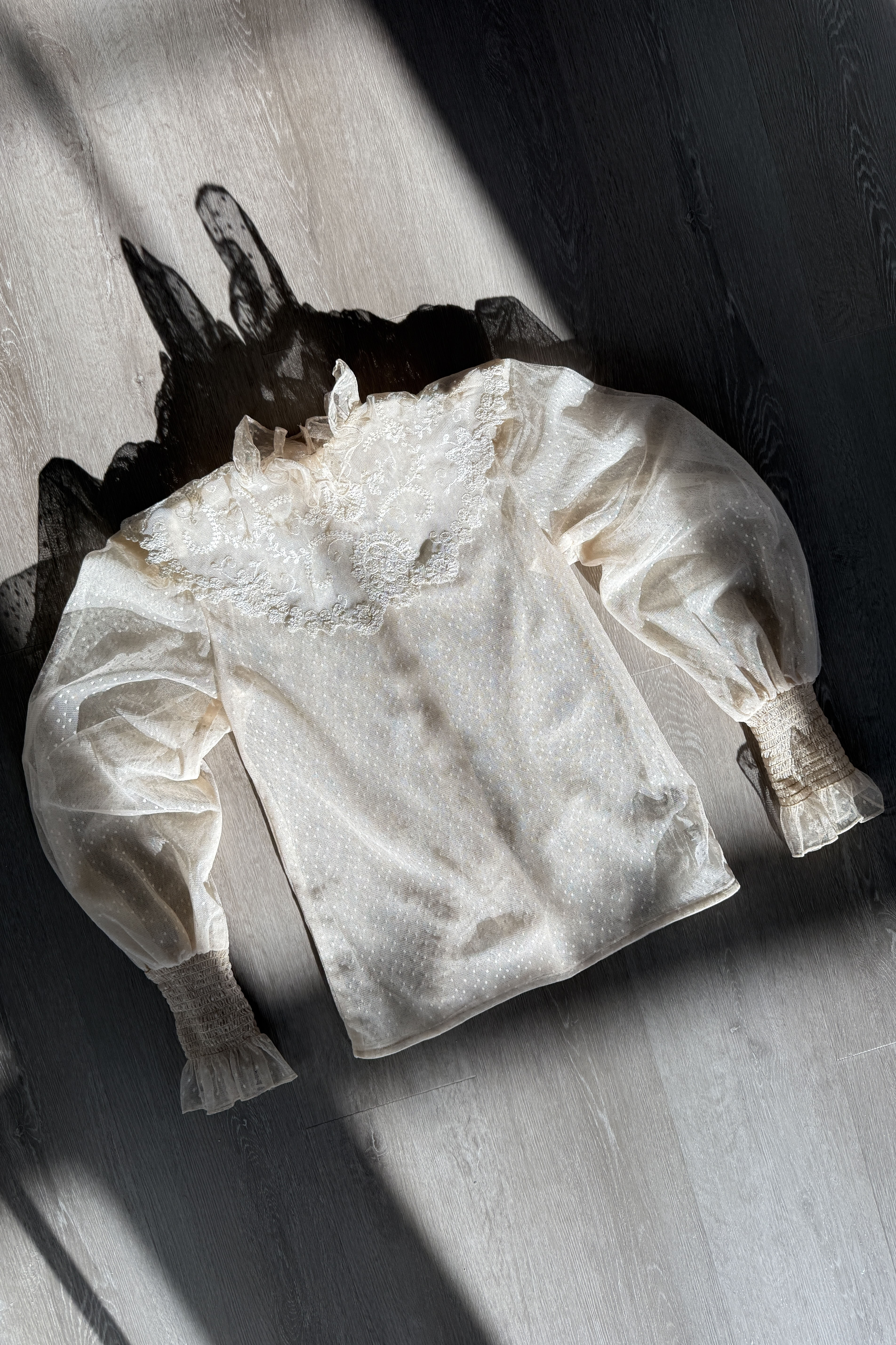 Vintage 1980s swiss dot mesh blouse with lace and delicate embroidery. Smocked sleeves, buttons in back. Perfect condition. By Mylesport for Neiman Marcus. Fits like small. Measurements (in inches):length: 23shoulders 13sleeves 27bust 36-38 0624 | 2539