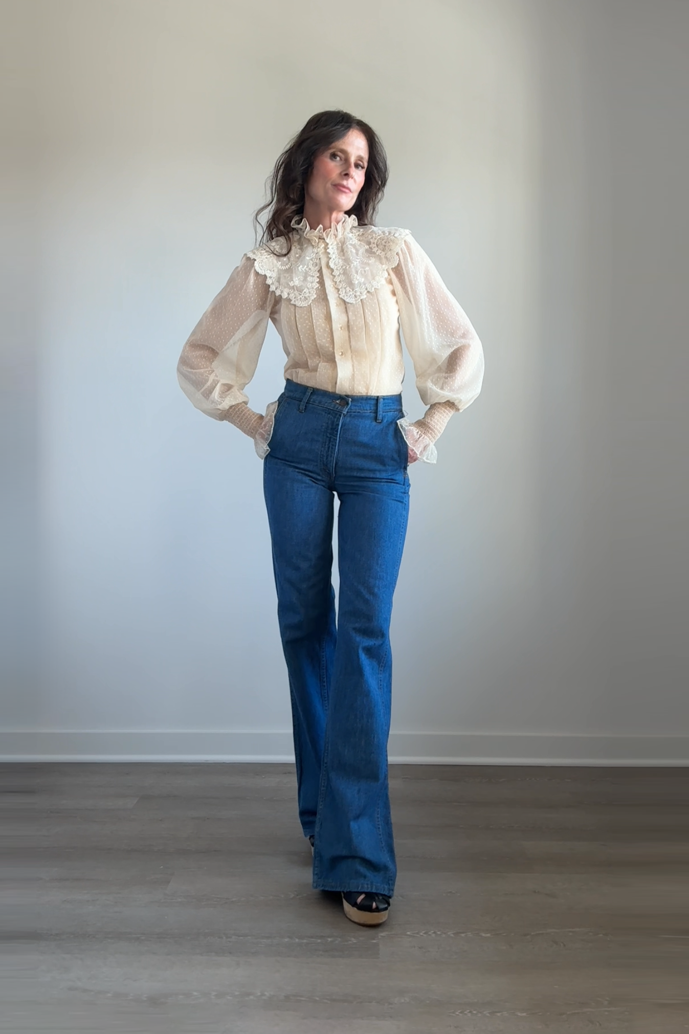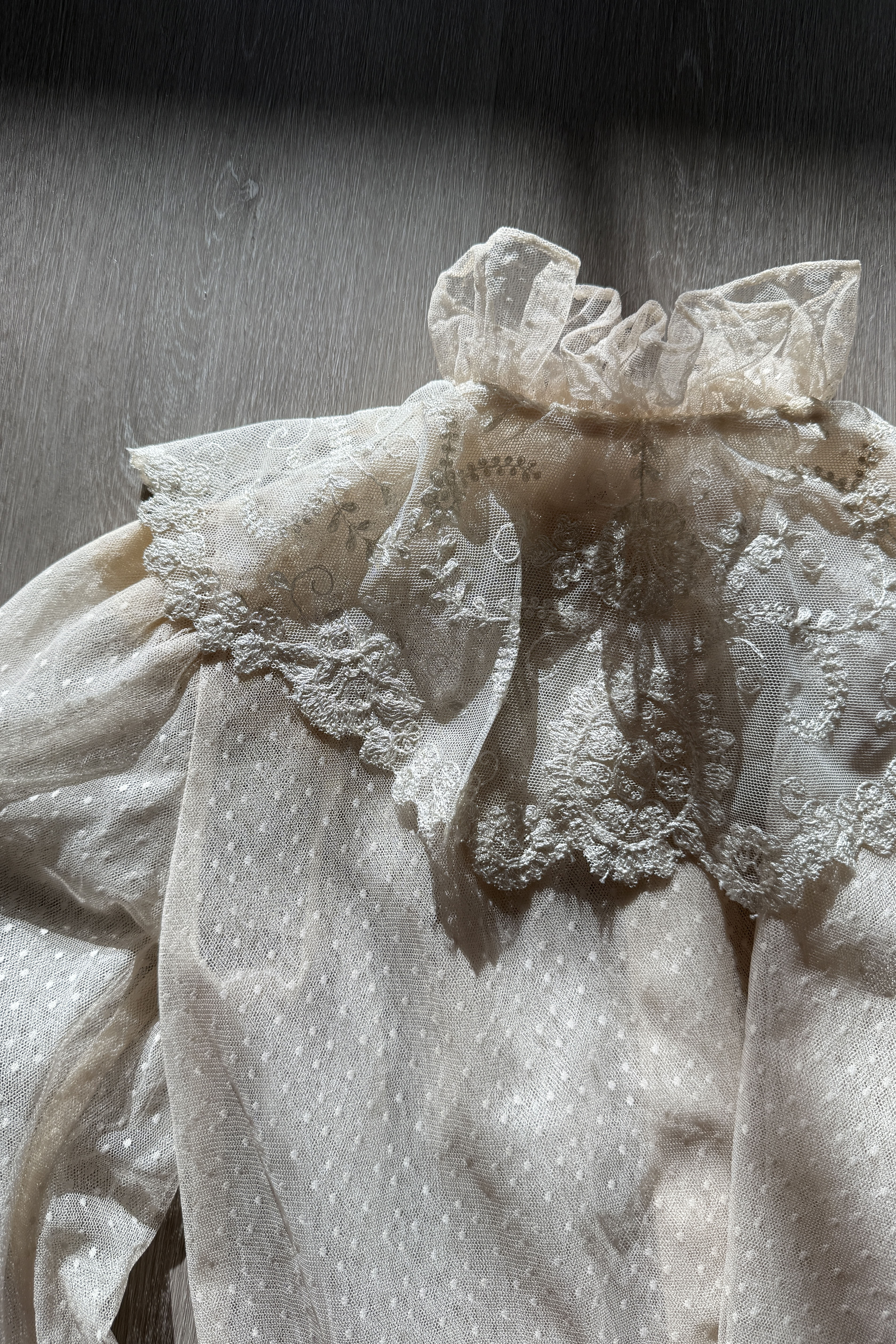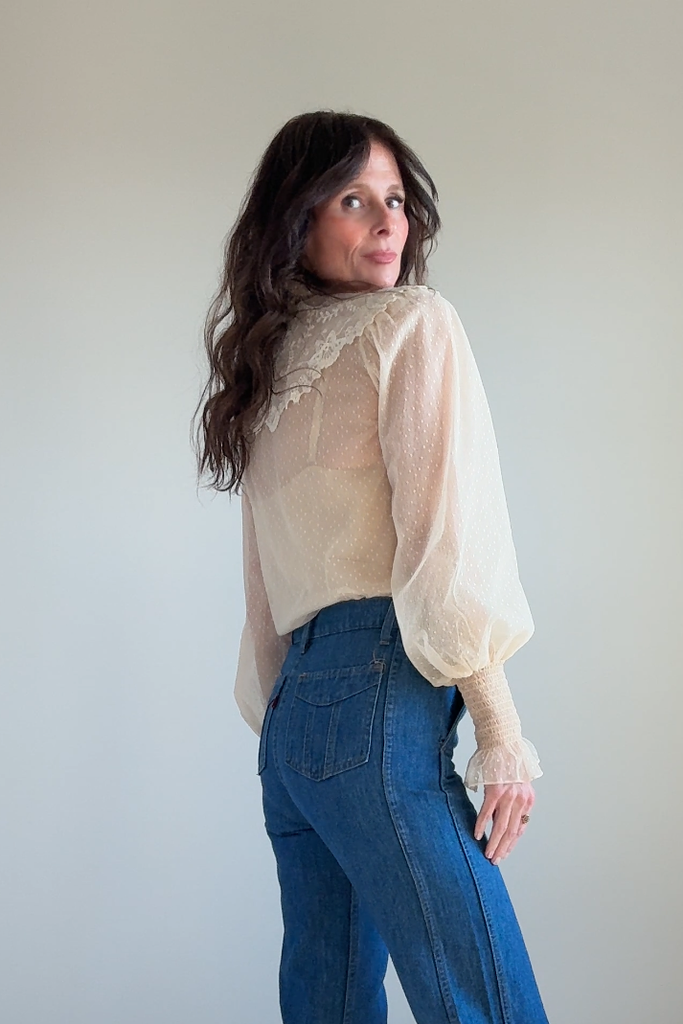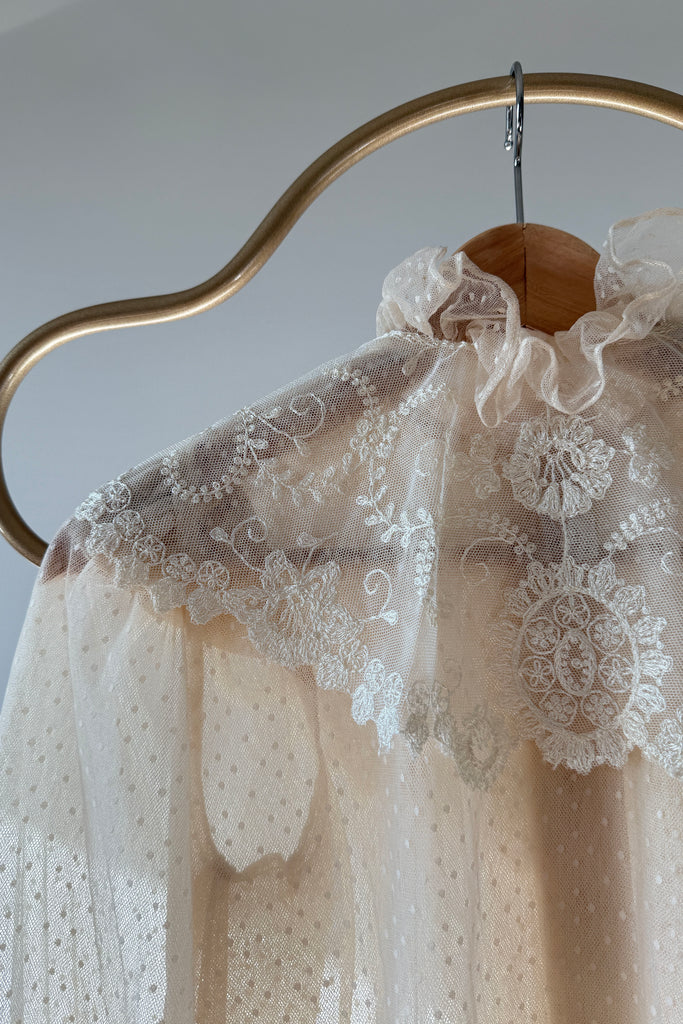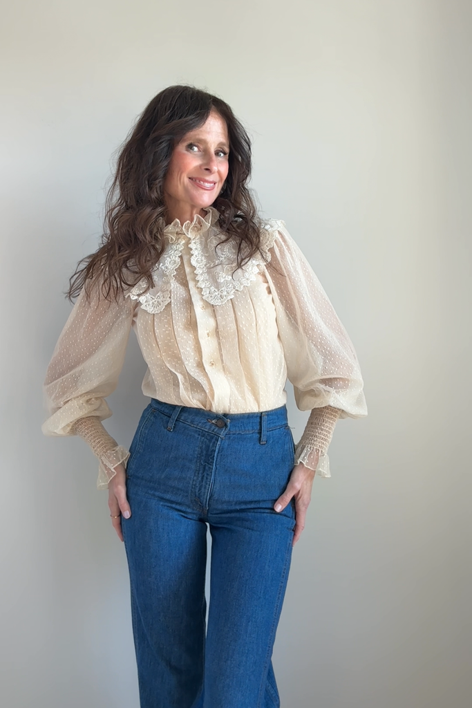 Vintage 1980s swiss dot mesh blouse with lace and delicate embroidery. Smocked sleeves, buttons in back. Perfect condition. By Mylesport for Neiman Marcus. Fits like small. Measurements (in inches):length: 23shoulders 13sleeves 27bust 36-38 0624 | 2539
