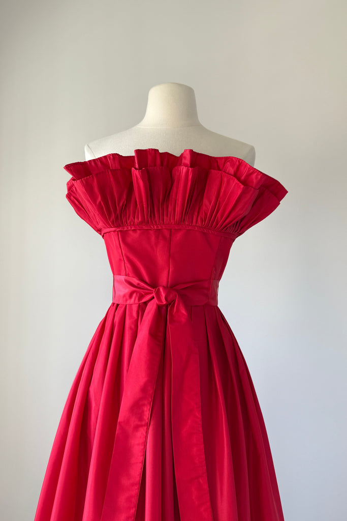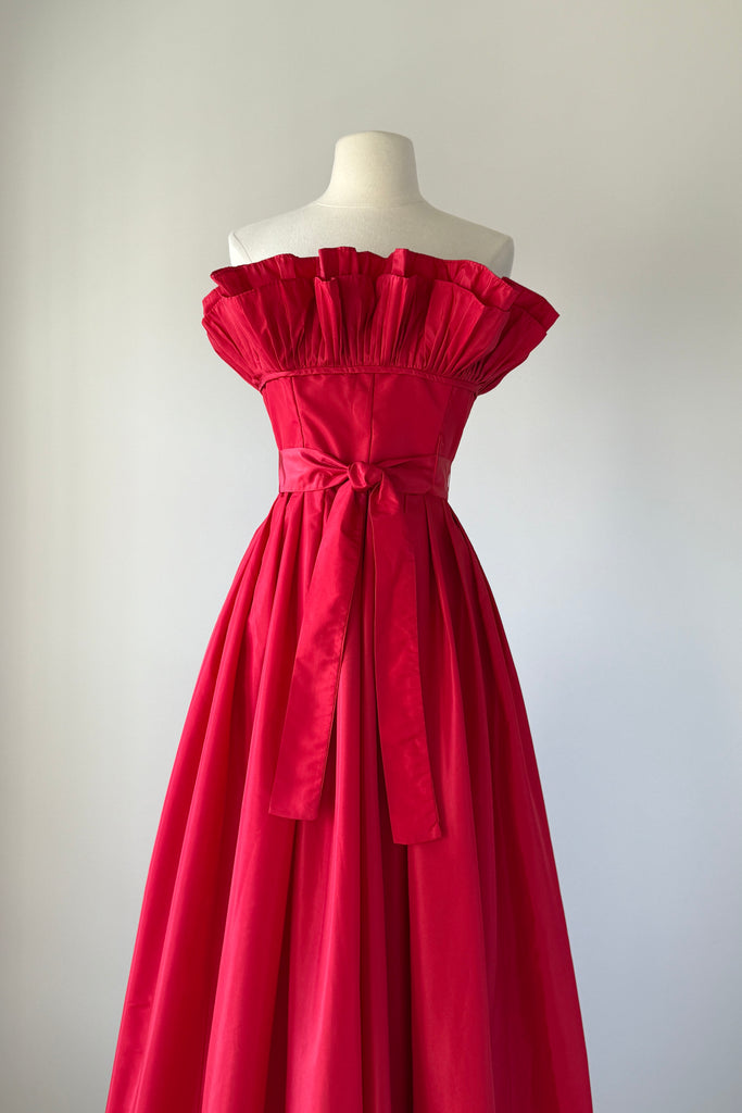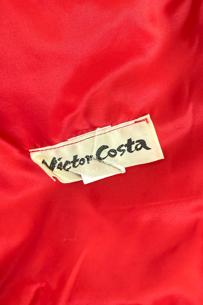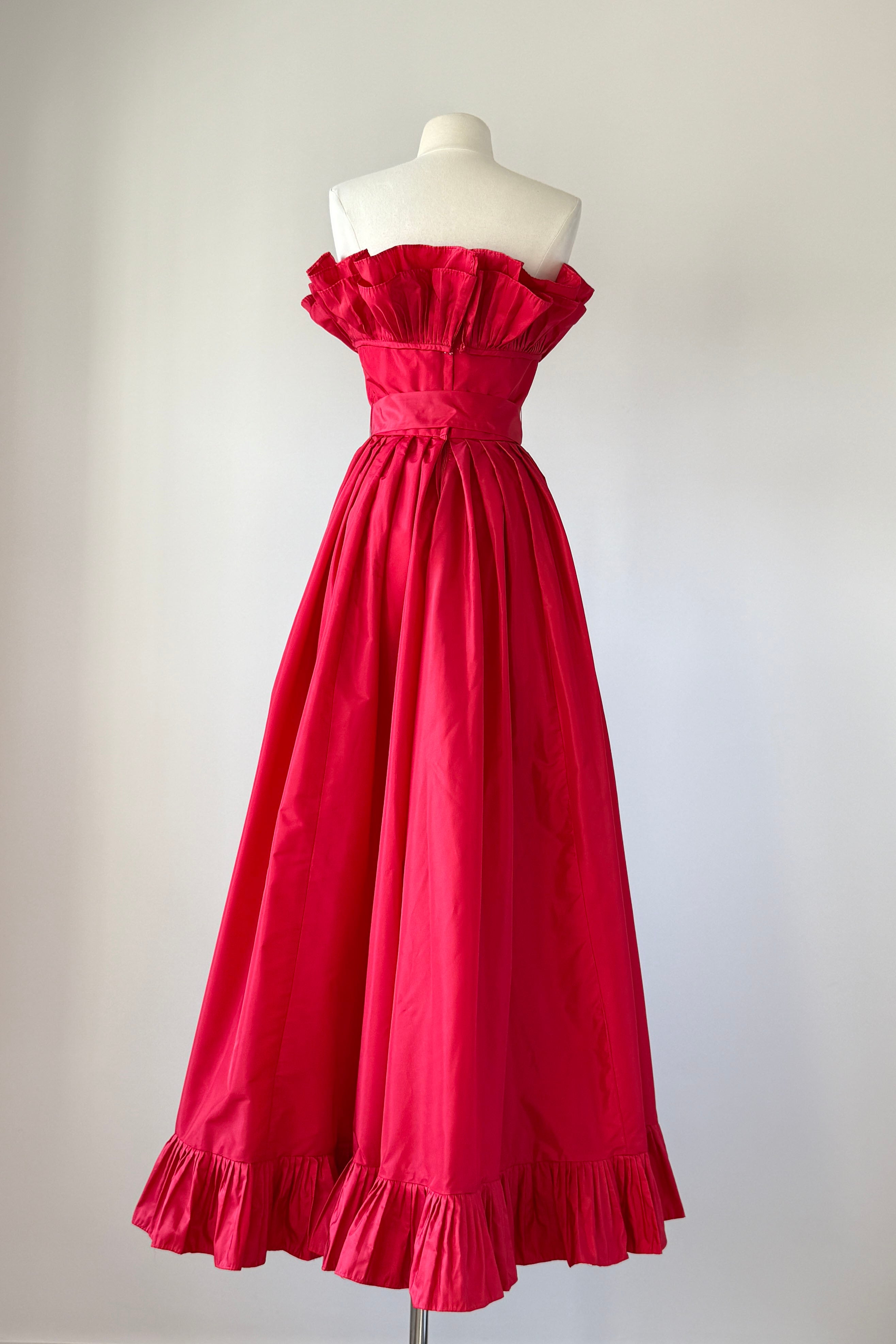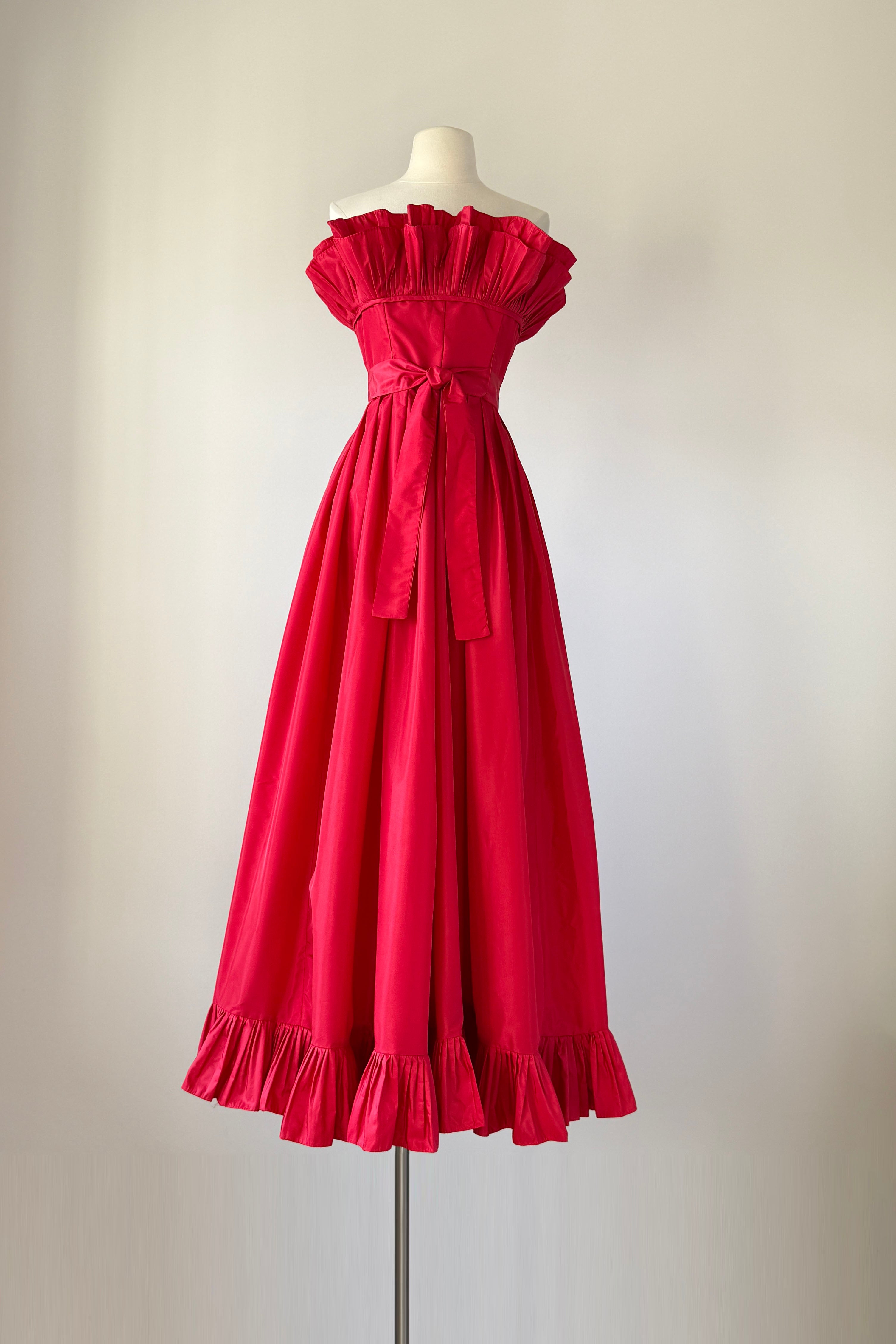 VINTAGE VICTOR COSTA DRESS1970s red taffeta gown with pleated ruffle trim, strapless bodice with stays, back zipper. Skirt pockets. By Victor Costa.Excellent condition. Fits like XS/SLength 54Bodice 10Bust 32-33Waist 25-26As with all vintage, please expect wear consistent with age. All sales are final. No order cancellations.0708 | 2546