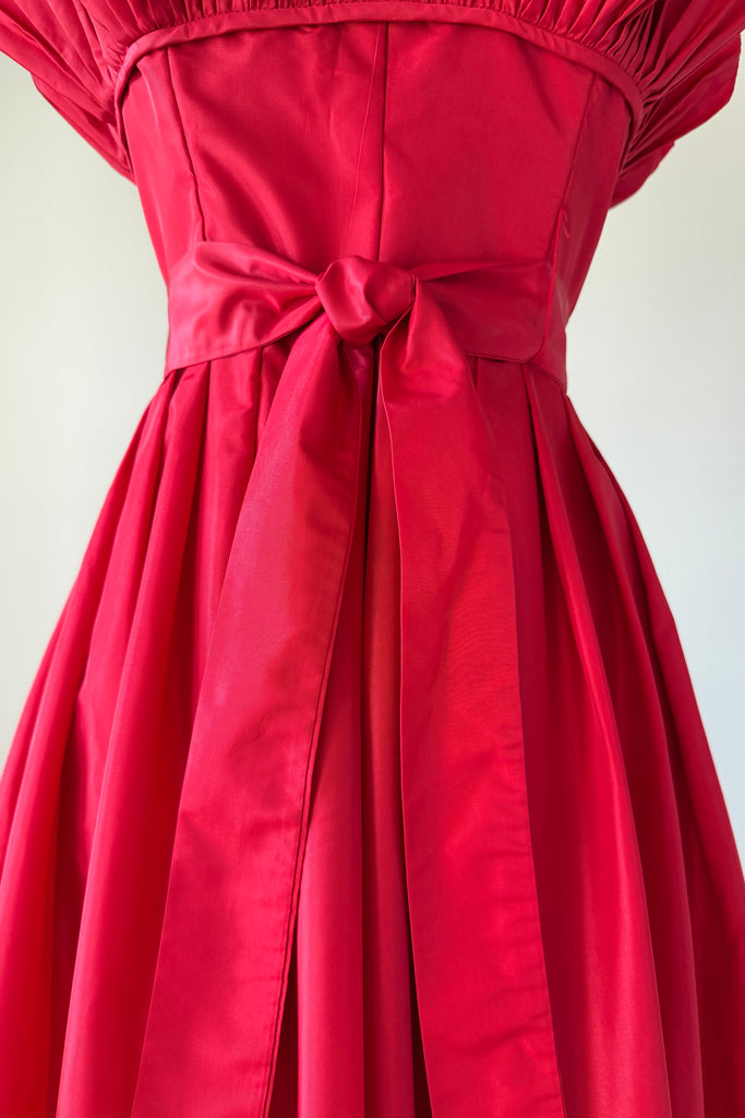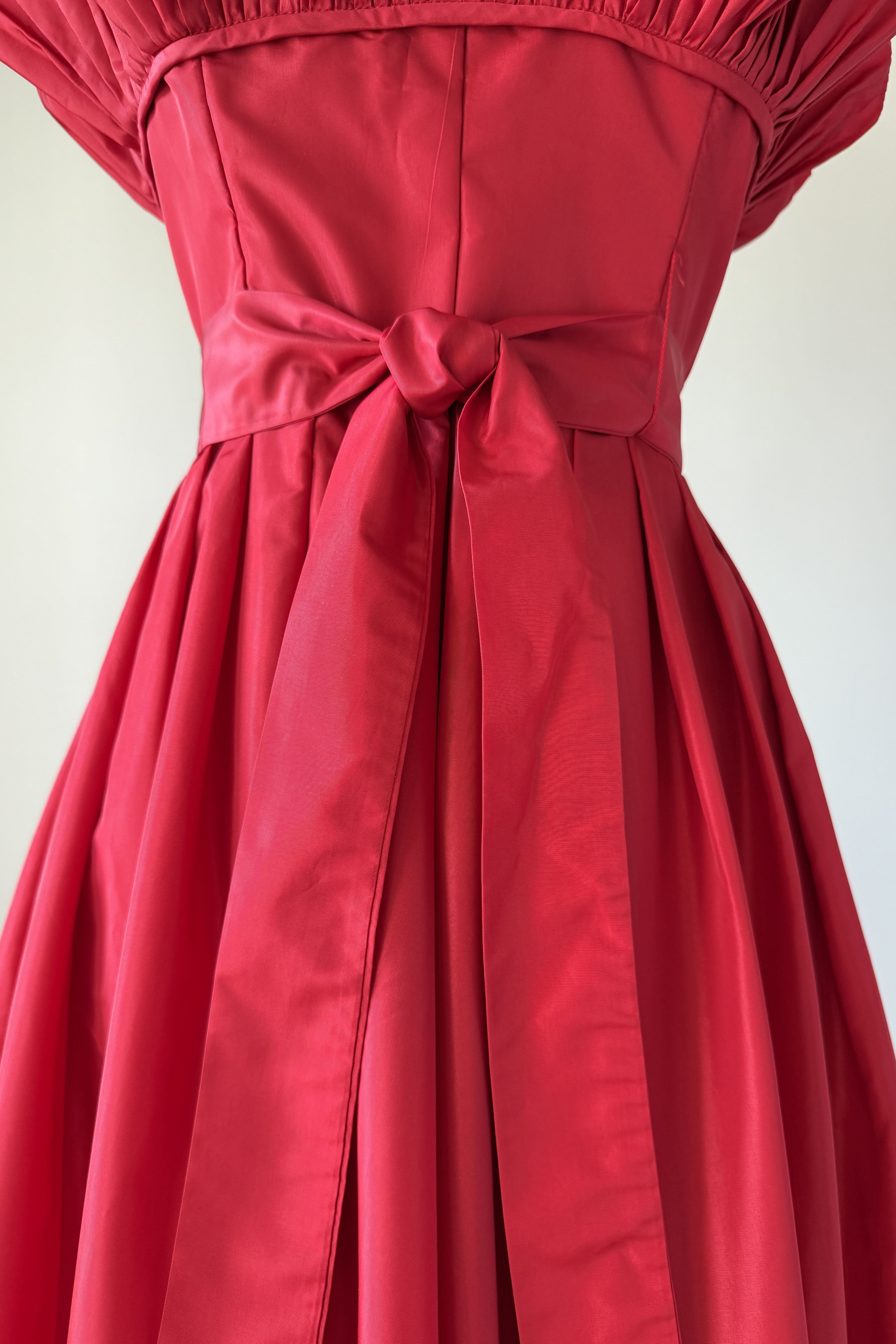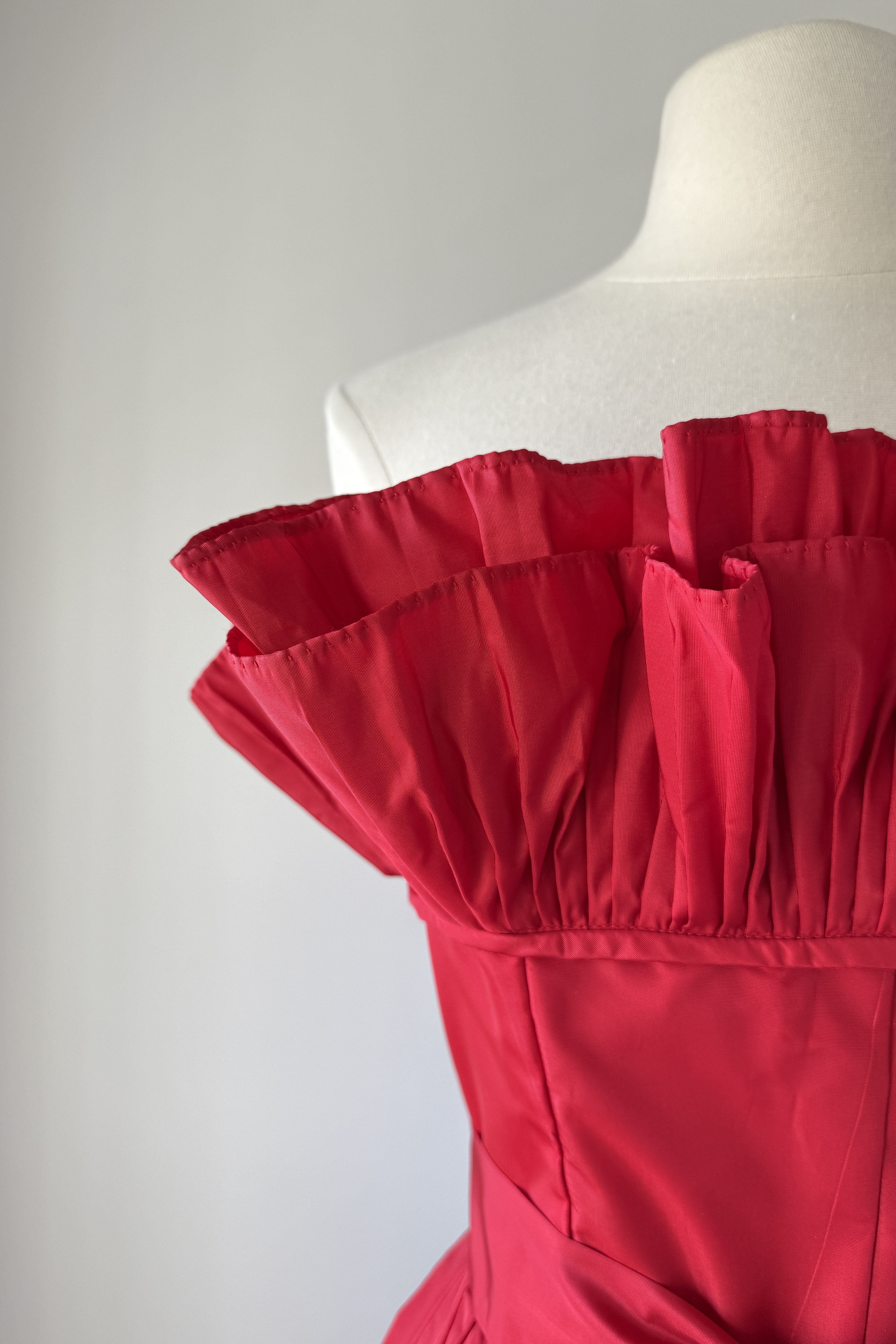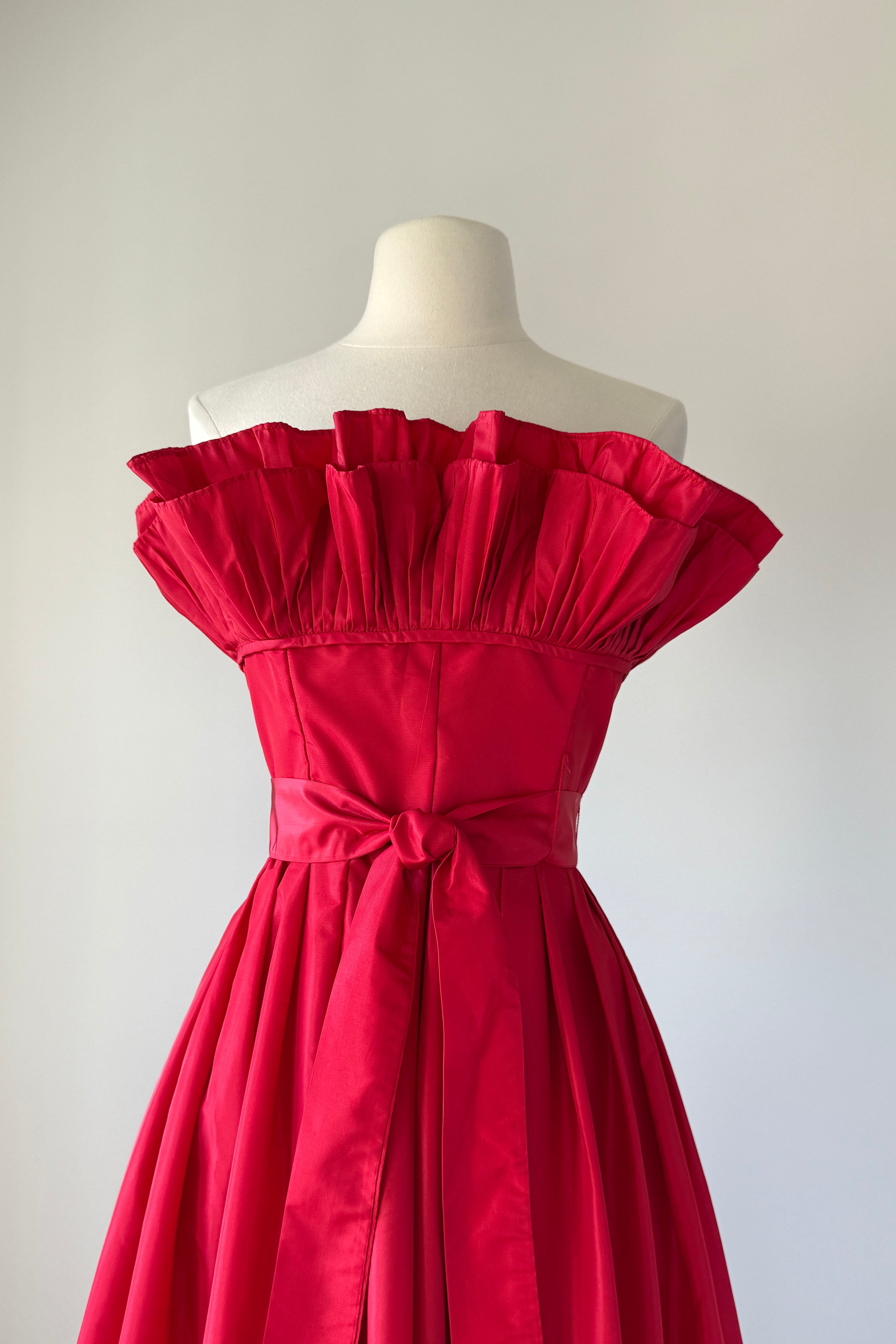VINTAGE VICTOR COSTA DRESS1970s red taffeta gown with pleated ruffle trim, strapless bodice with stays, back zipper. Skirt pockets. By Victor Costa.Excellent condition. Fits like XS/SLength 54Bodice 10Bust 32-33Waist 25-26As with all vintage, please expect wear consistent with age. All sales are final. No order cancellations.0708 | 2546