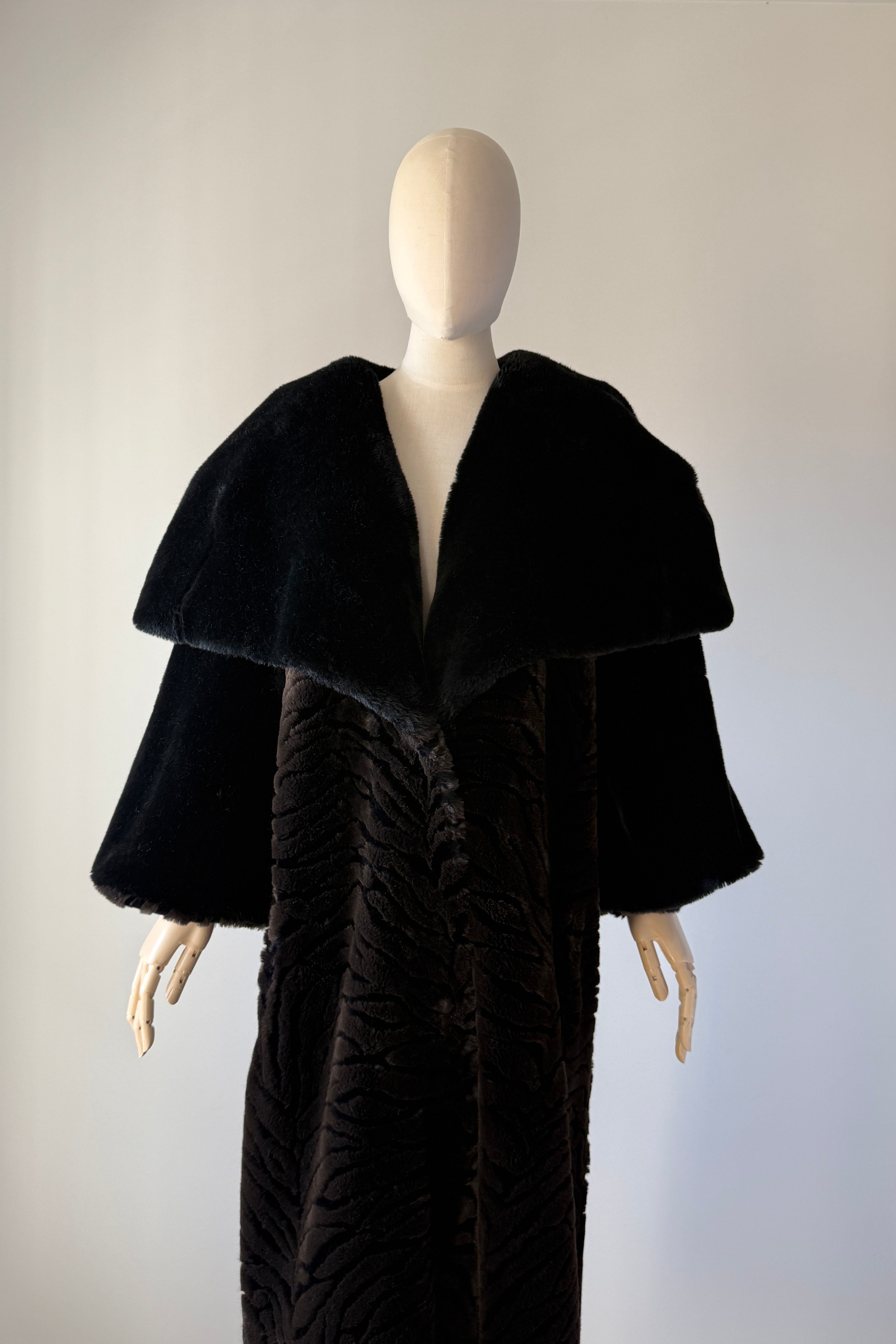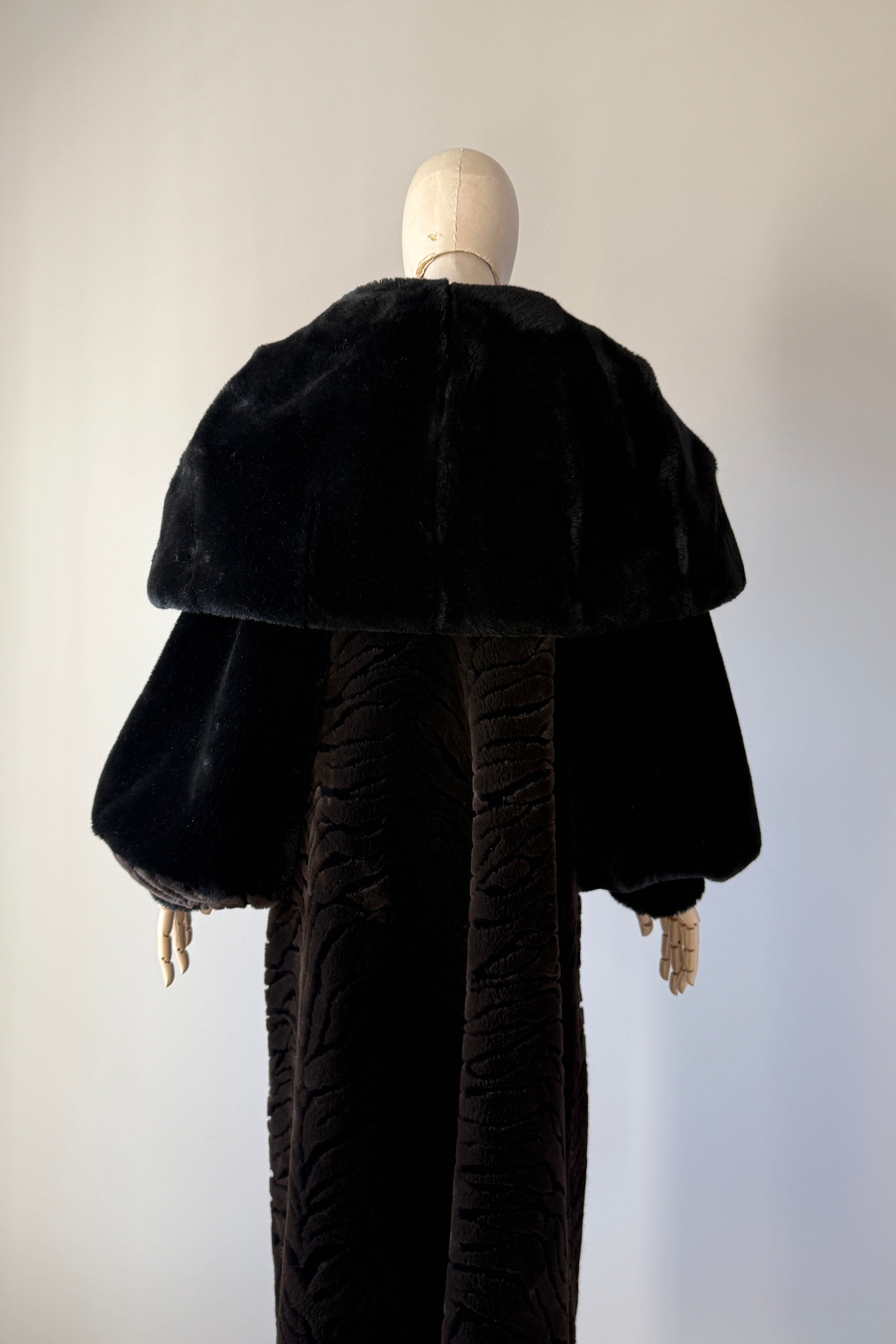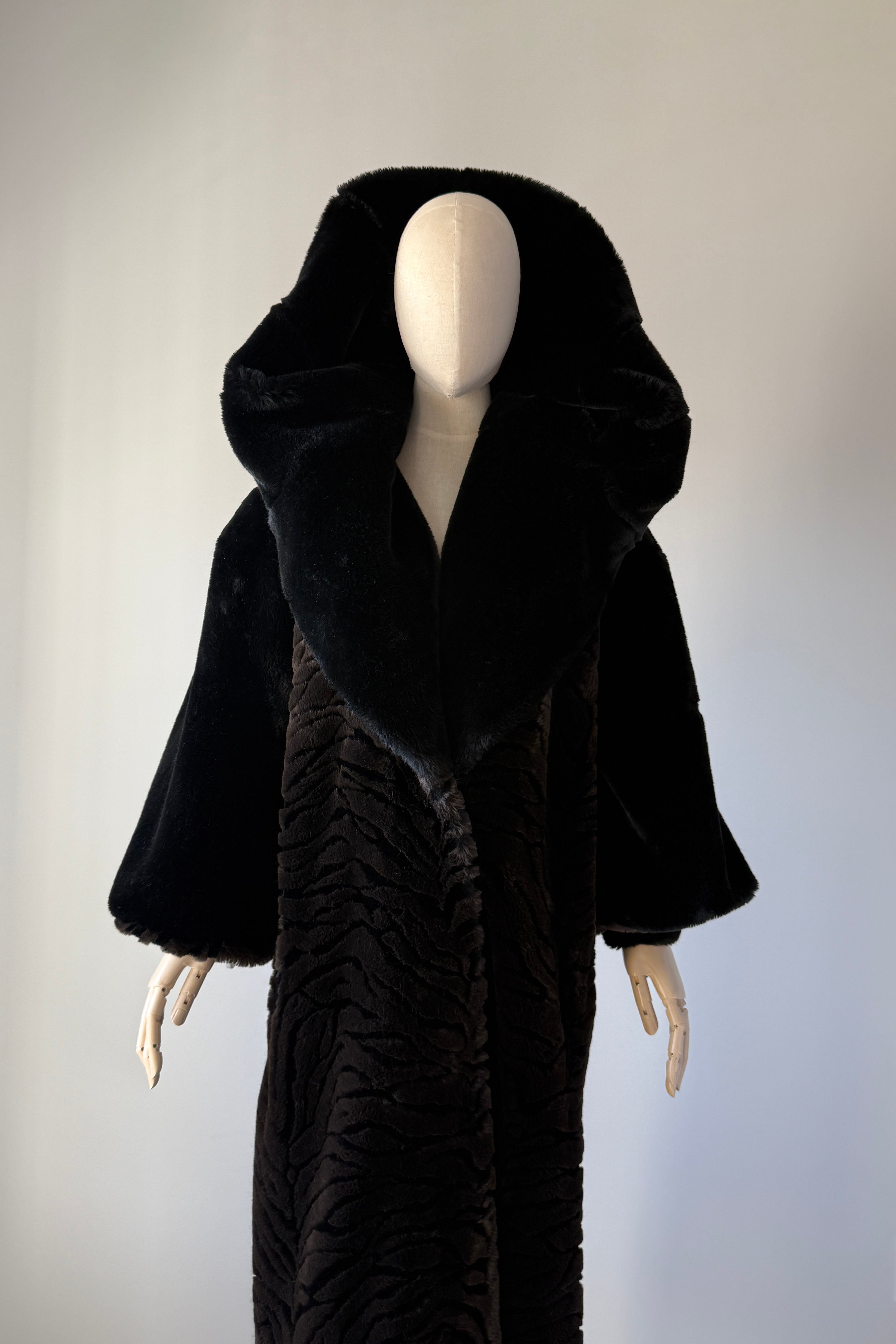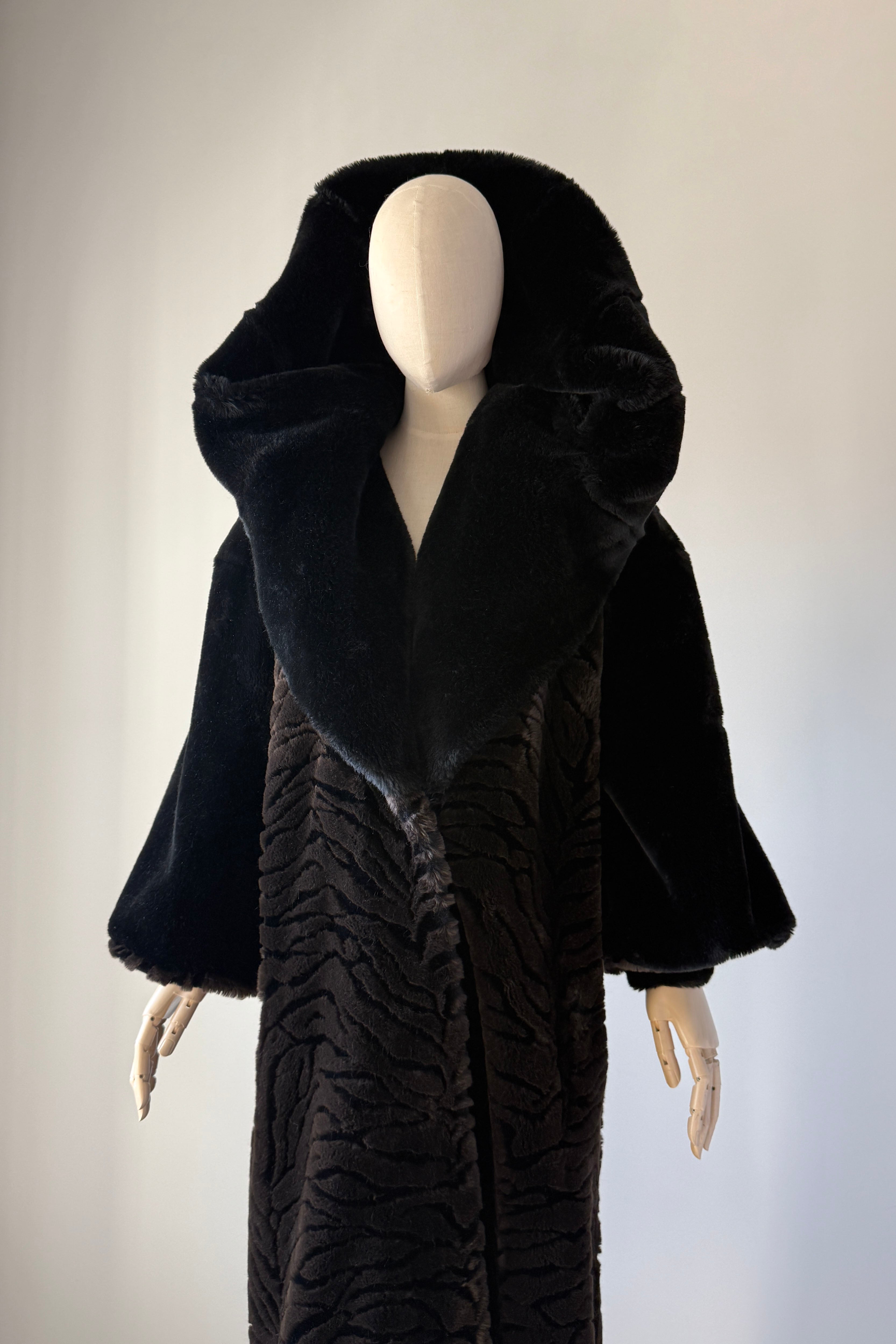VINTAGE PLUSH COATVintage 1980s heavy plush coat. Black with tiger stripe bodice and cuffs. Dramatic statement collar can be worn hooded, up or folded. Hook/eye closures, pockets, acetate lining. By Kent Street. Excellent condition.Fits like XS-LLength 47Bust 44Waist 54As with all vintage, please expect wear consistent with age. All sales are final. No order cancellations.0785 | 2602