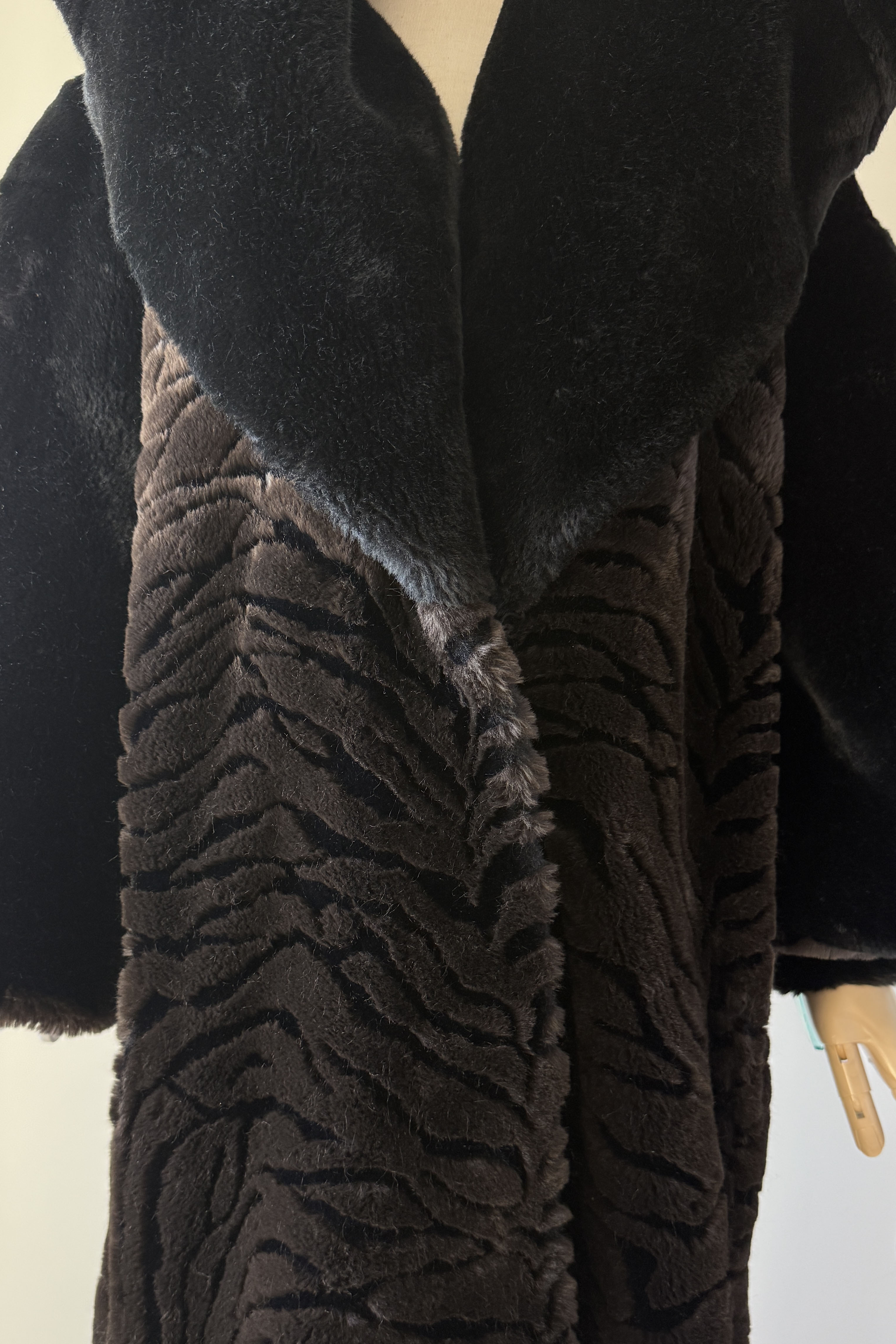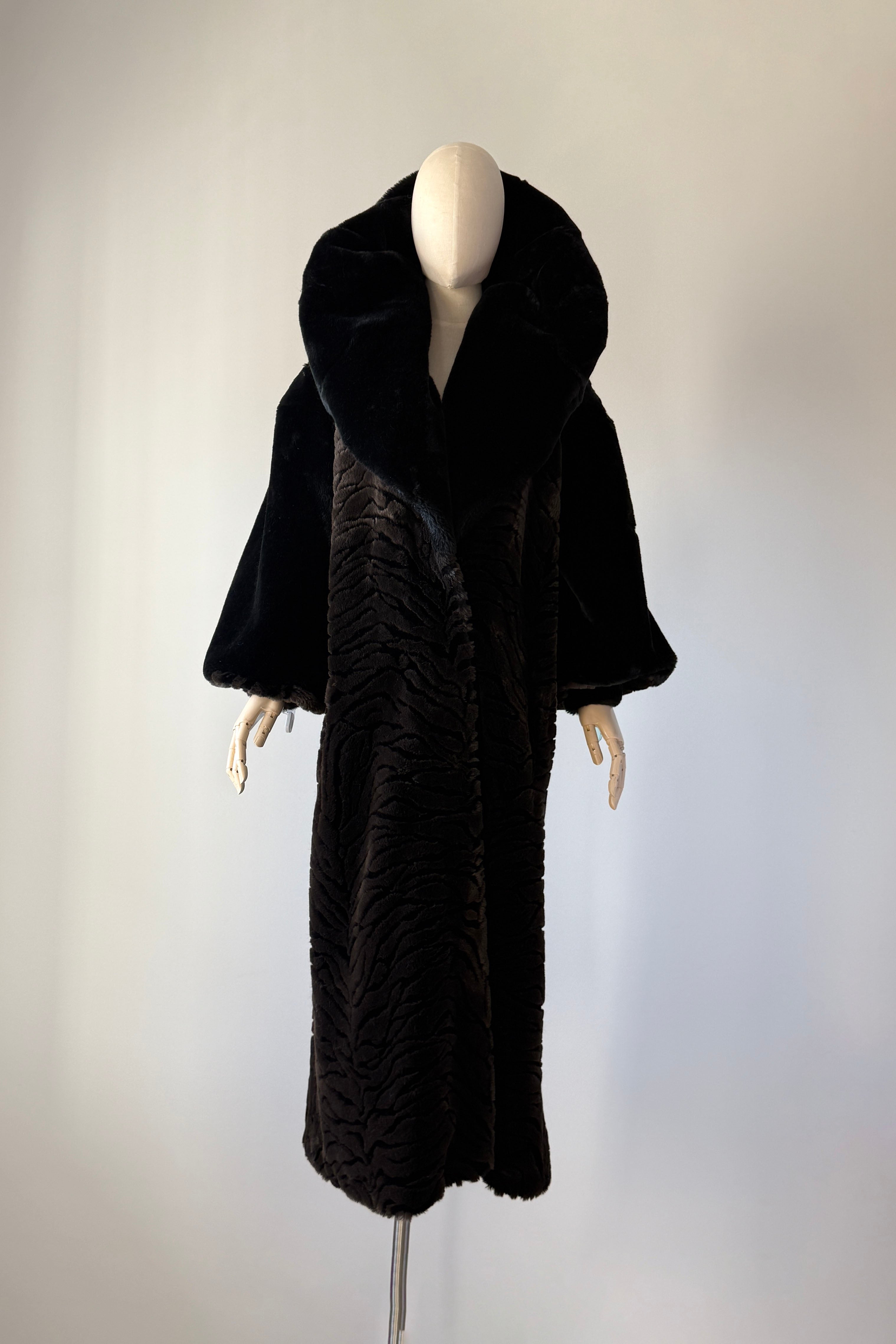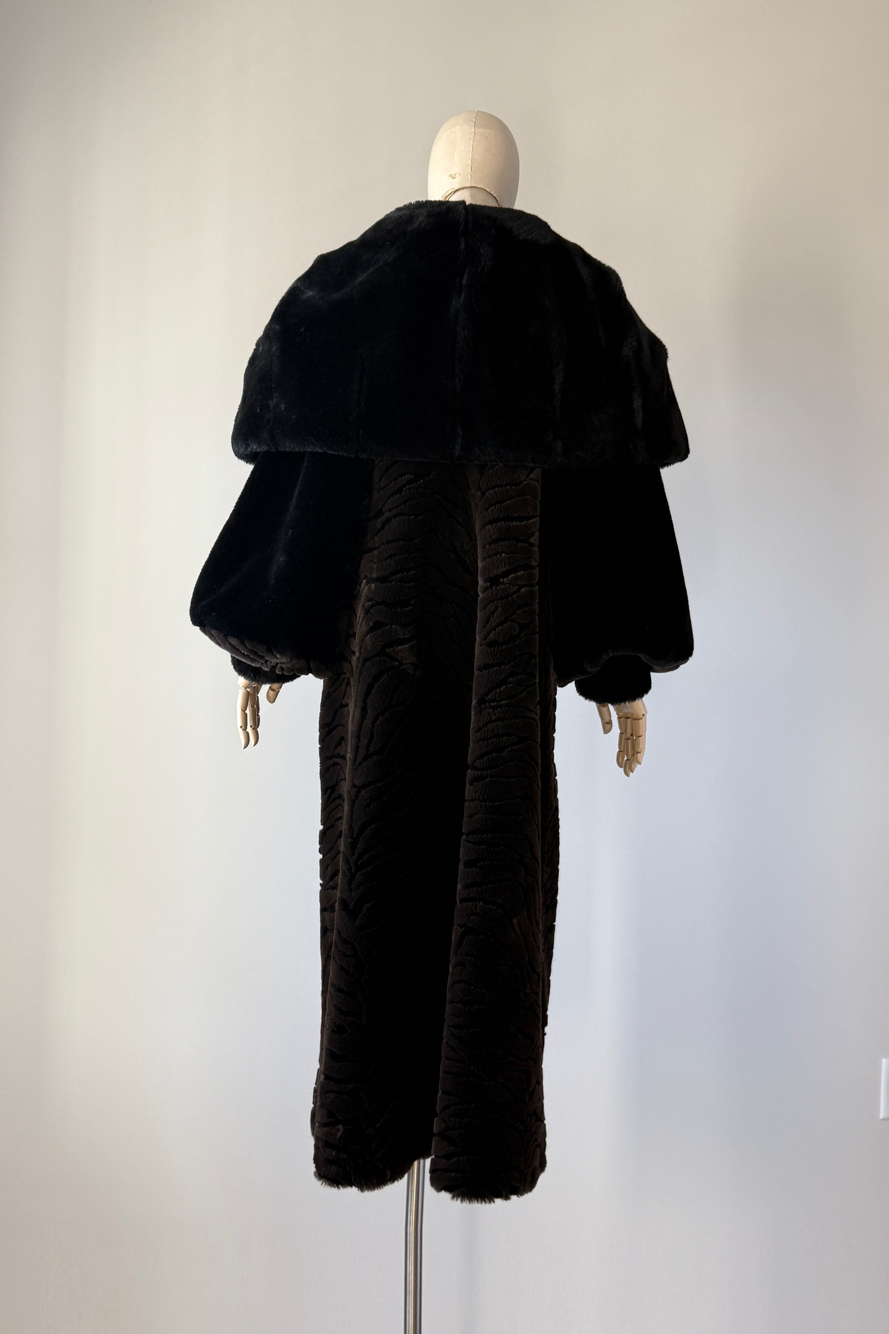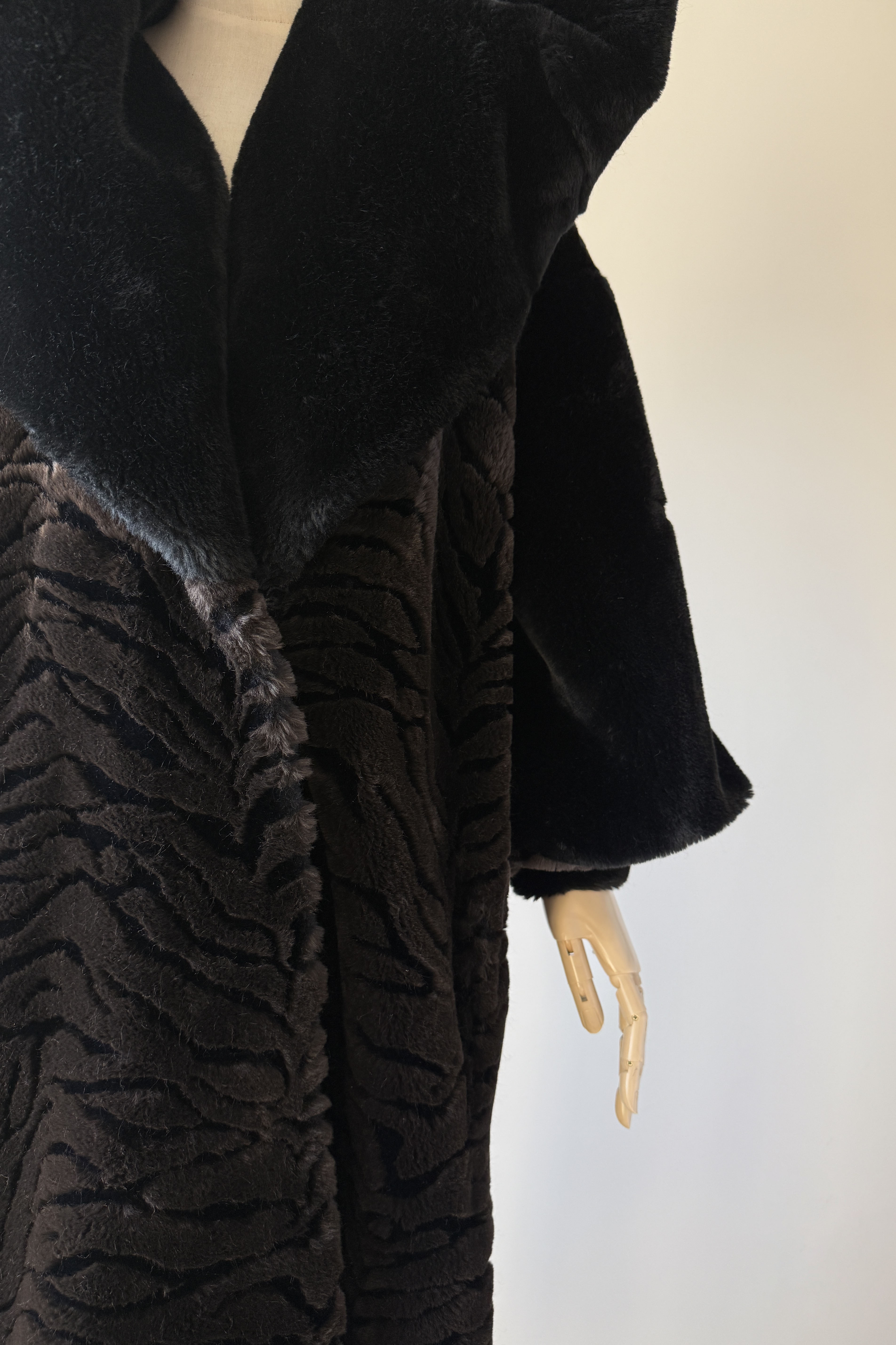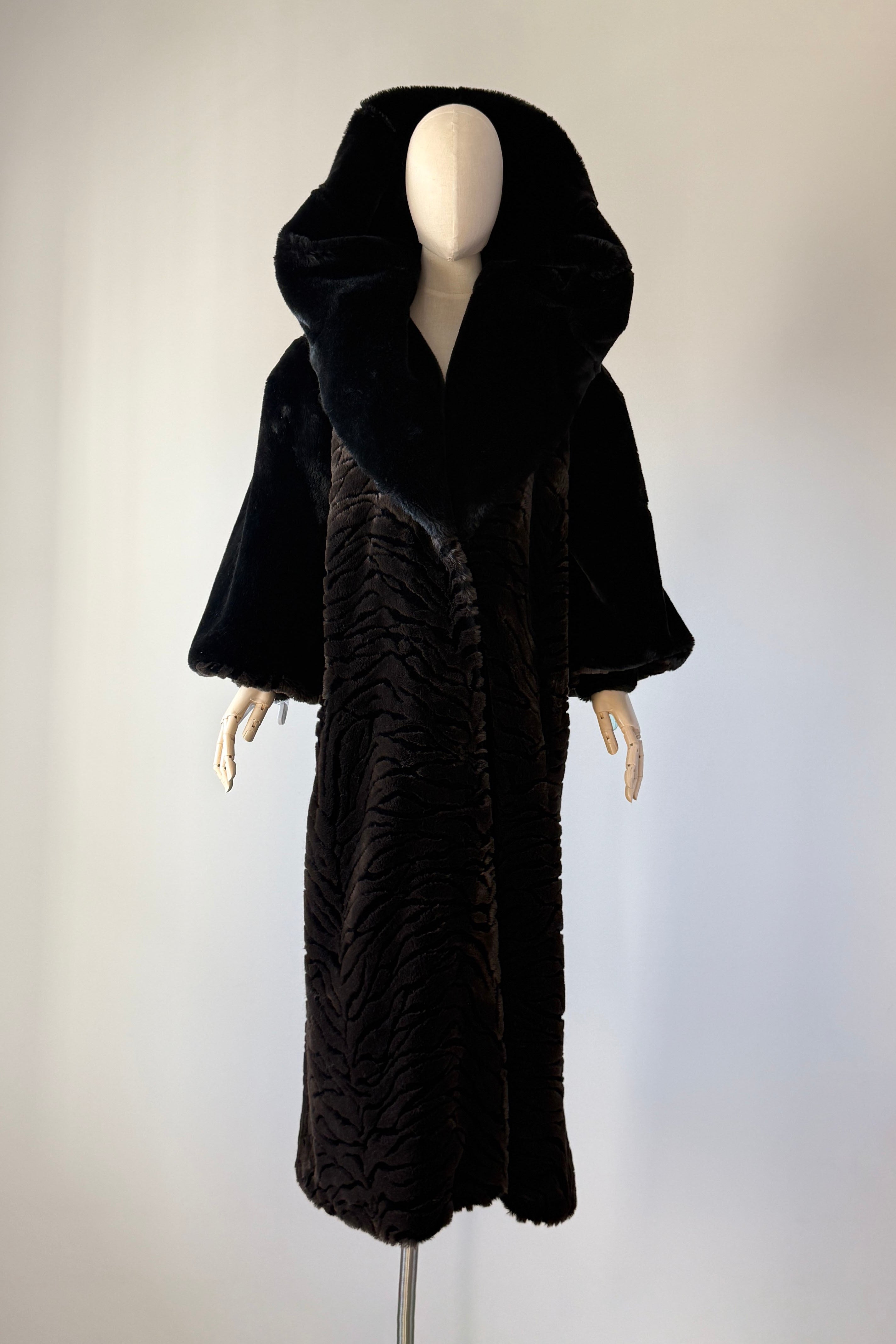 VINTAGE PLUSH COATVintage 1980s heavy plush coat. Black with tiger stripe bodice and cuffs. Dramatic statement collar can be worn hooded, up or folded. Hook/eye closures, pockets, acetate lining. By Kent Street. Excellent condition.Fits like XS-LLength 47Bust 44Waist 54As with all vintage, please expect wear consistent with age. All sales are final. No order cancellations.0785 | 2602