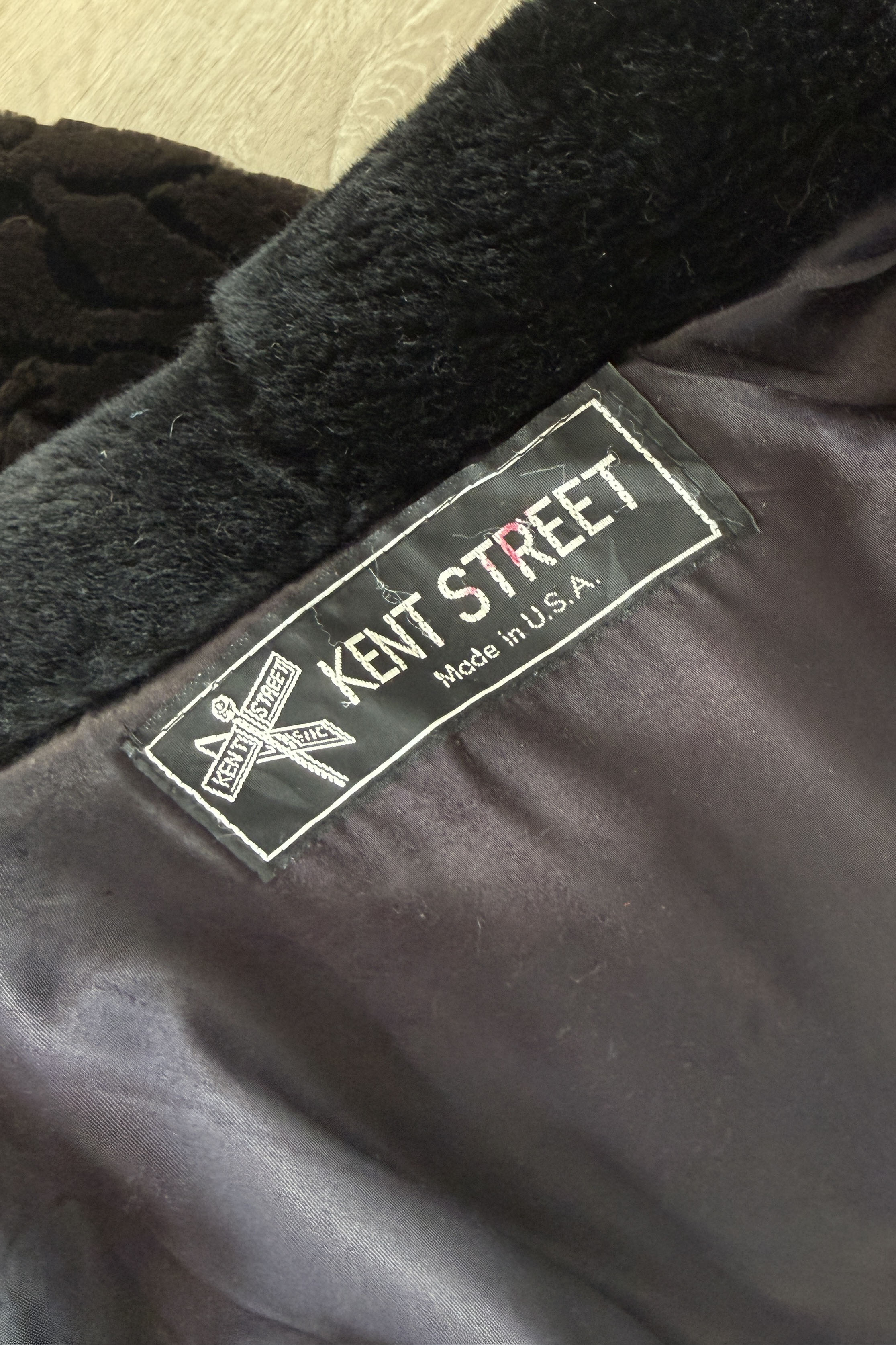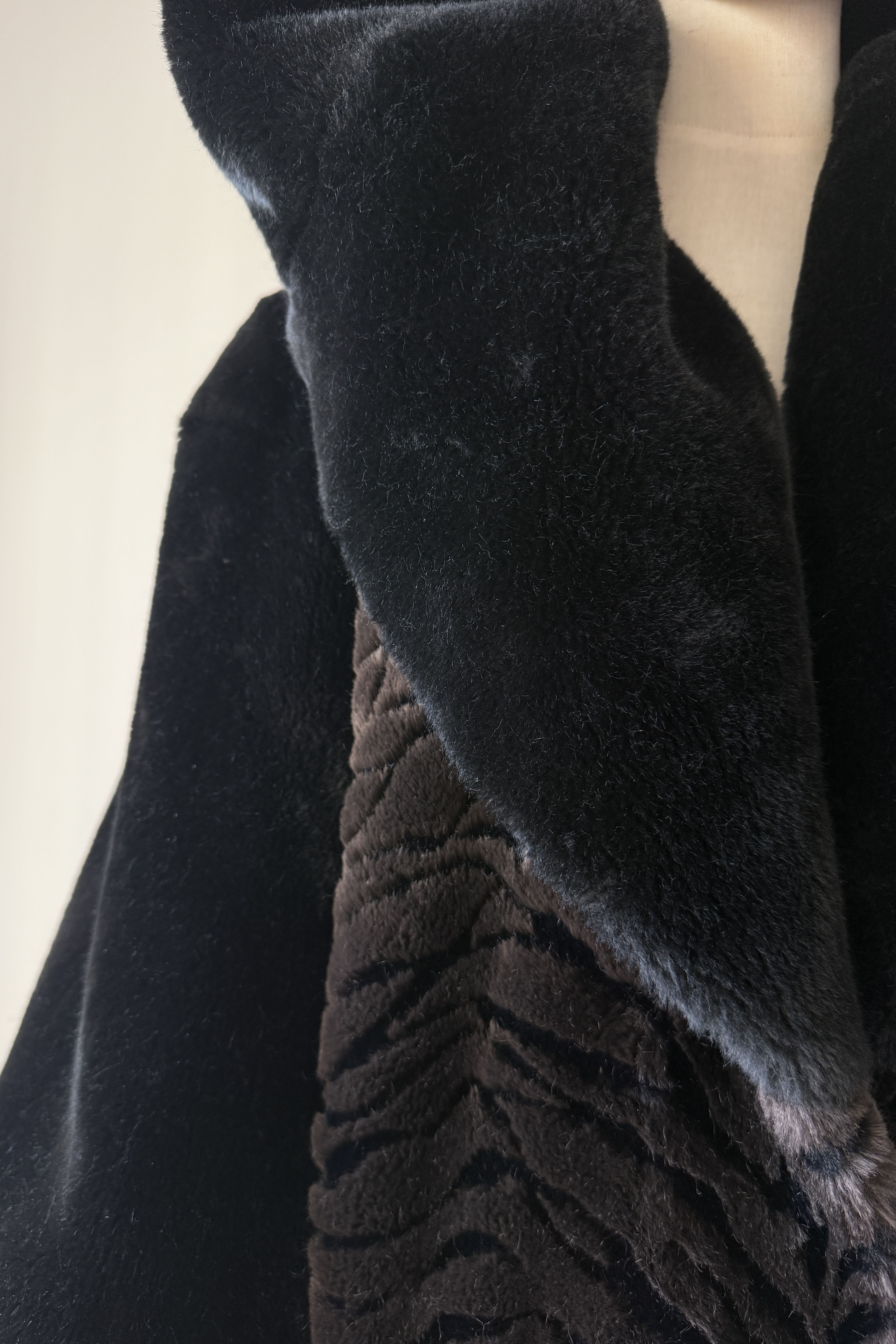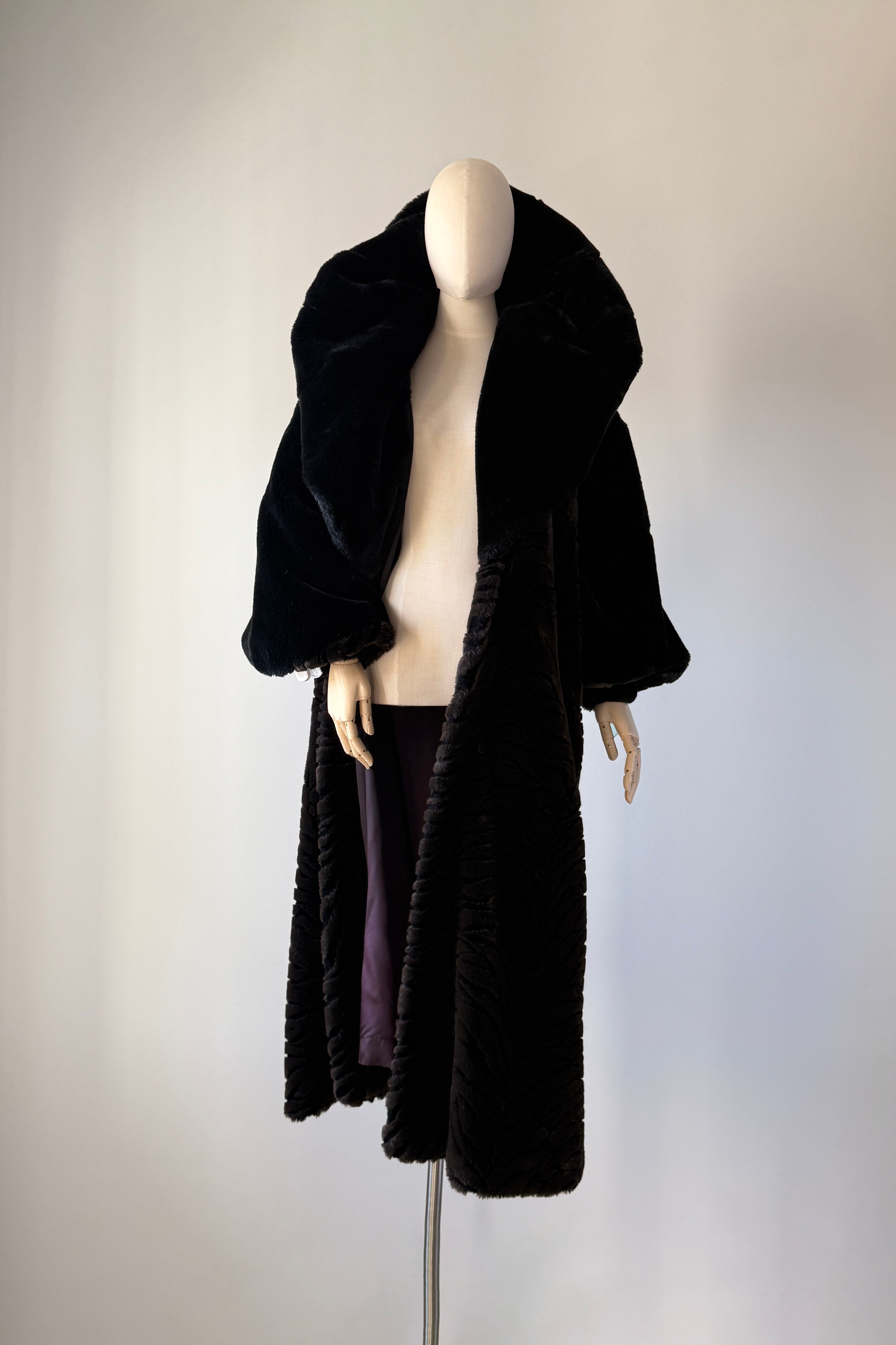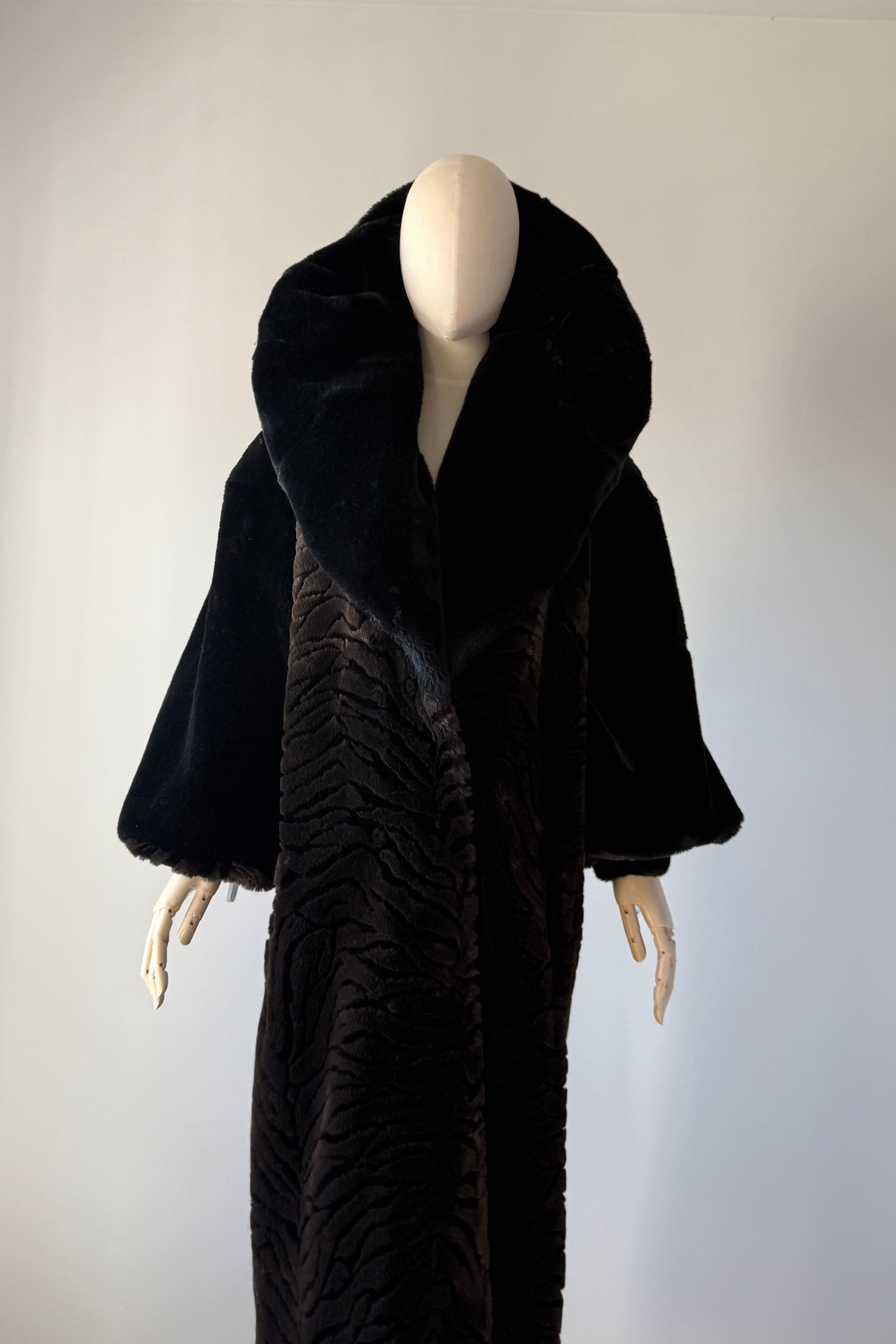 VINTAGE PLUSH COATVintage 1980s heavy plush coat. Black with tiger stripe bodice and cuffs. Dramatic statement collar can be worn hooded, up or folded. Hook/eye closures, pockets, acetate lining. By Kent Street. Excellent condition.Fits like XS-LLength 47Bust 44Waist 54As with all vintage, please expect wear consistent with age. All sales are final. No order cancellations.0785 | 2602