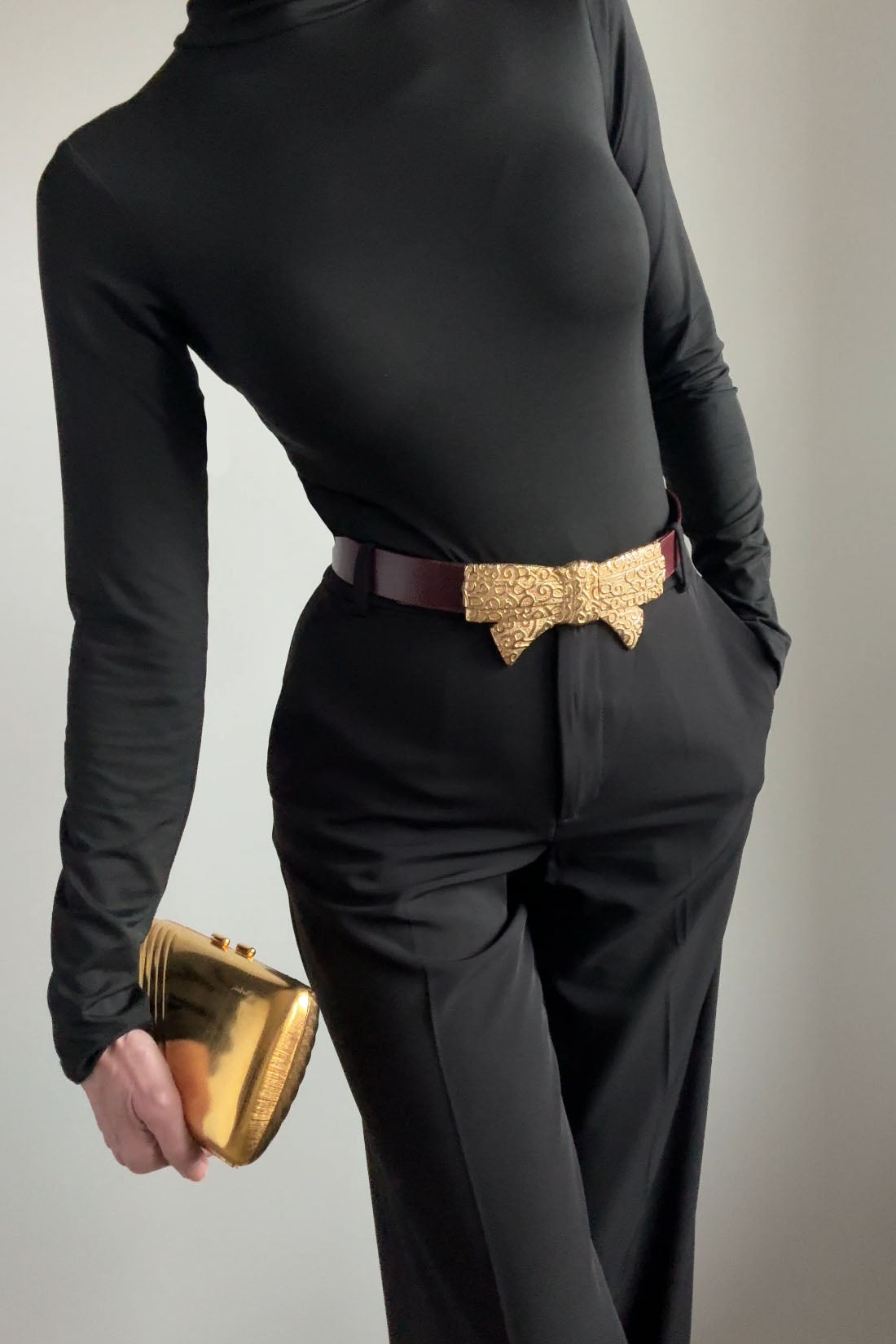 Vintage brushed gold metal back with metal rope strap. Velvet lining. Strap can be stored inside for use as a clutch. Comes with original back , (still activated) scented tissue paper and dust bag. By Pierre Cardin.
