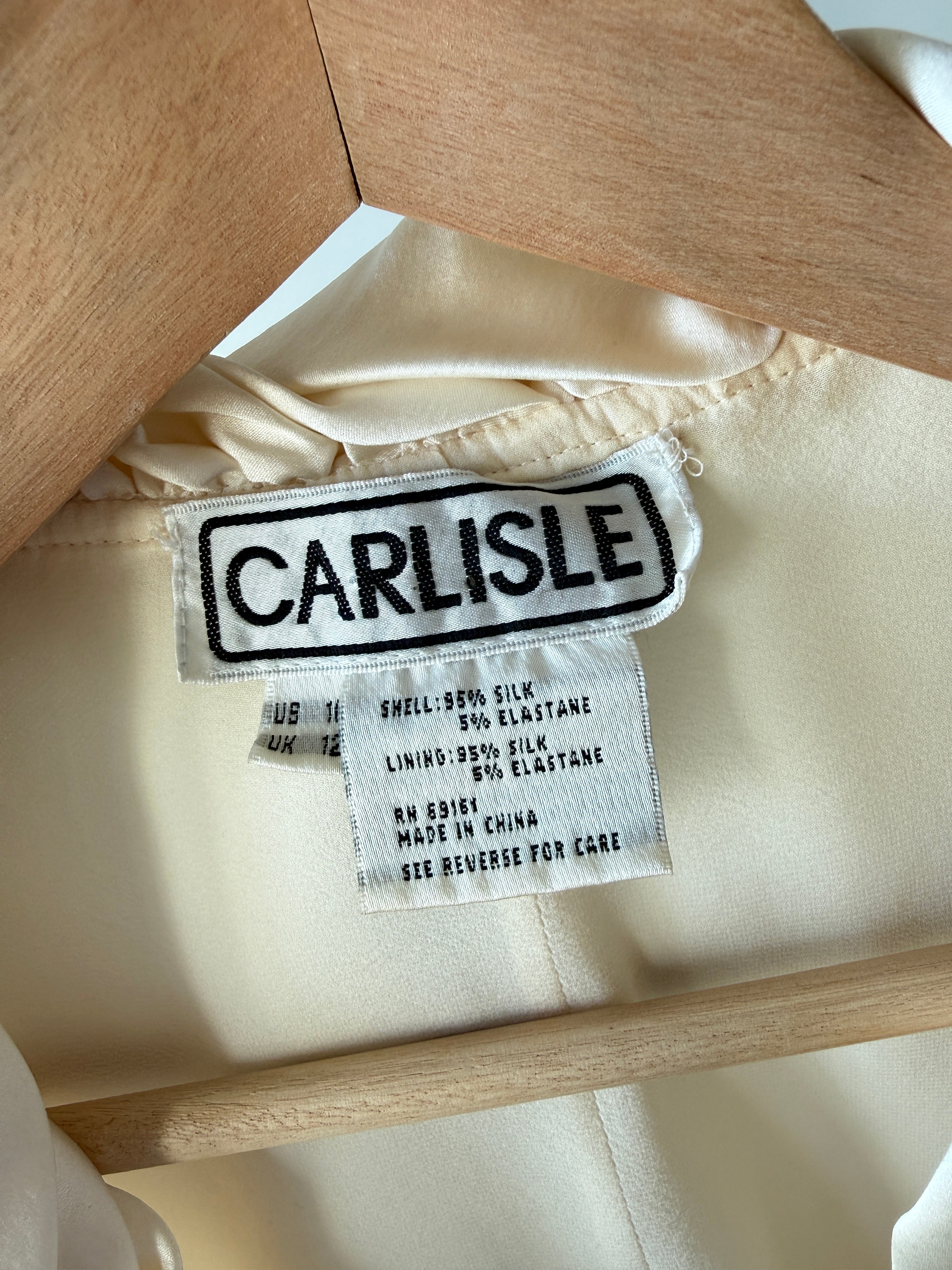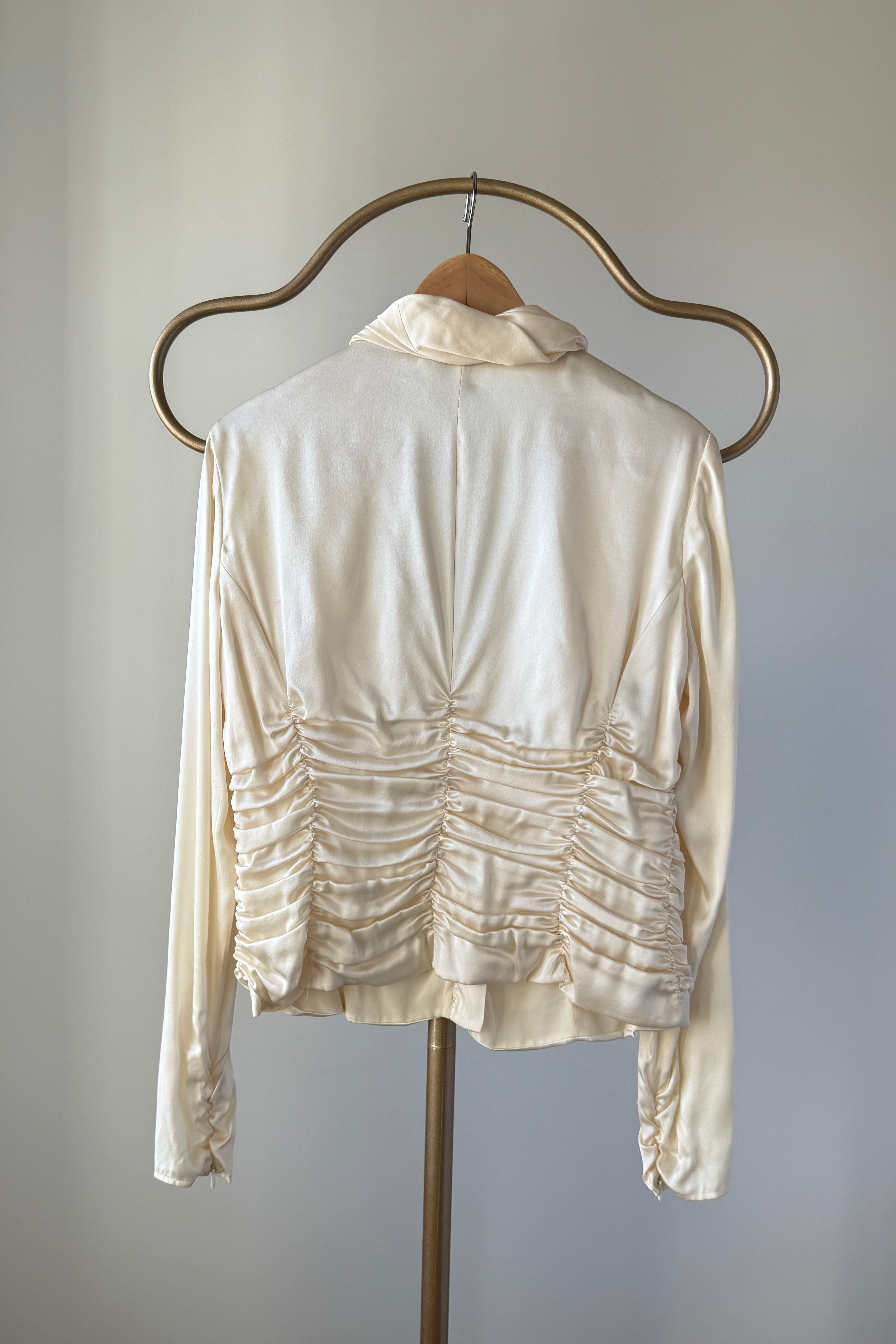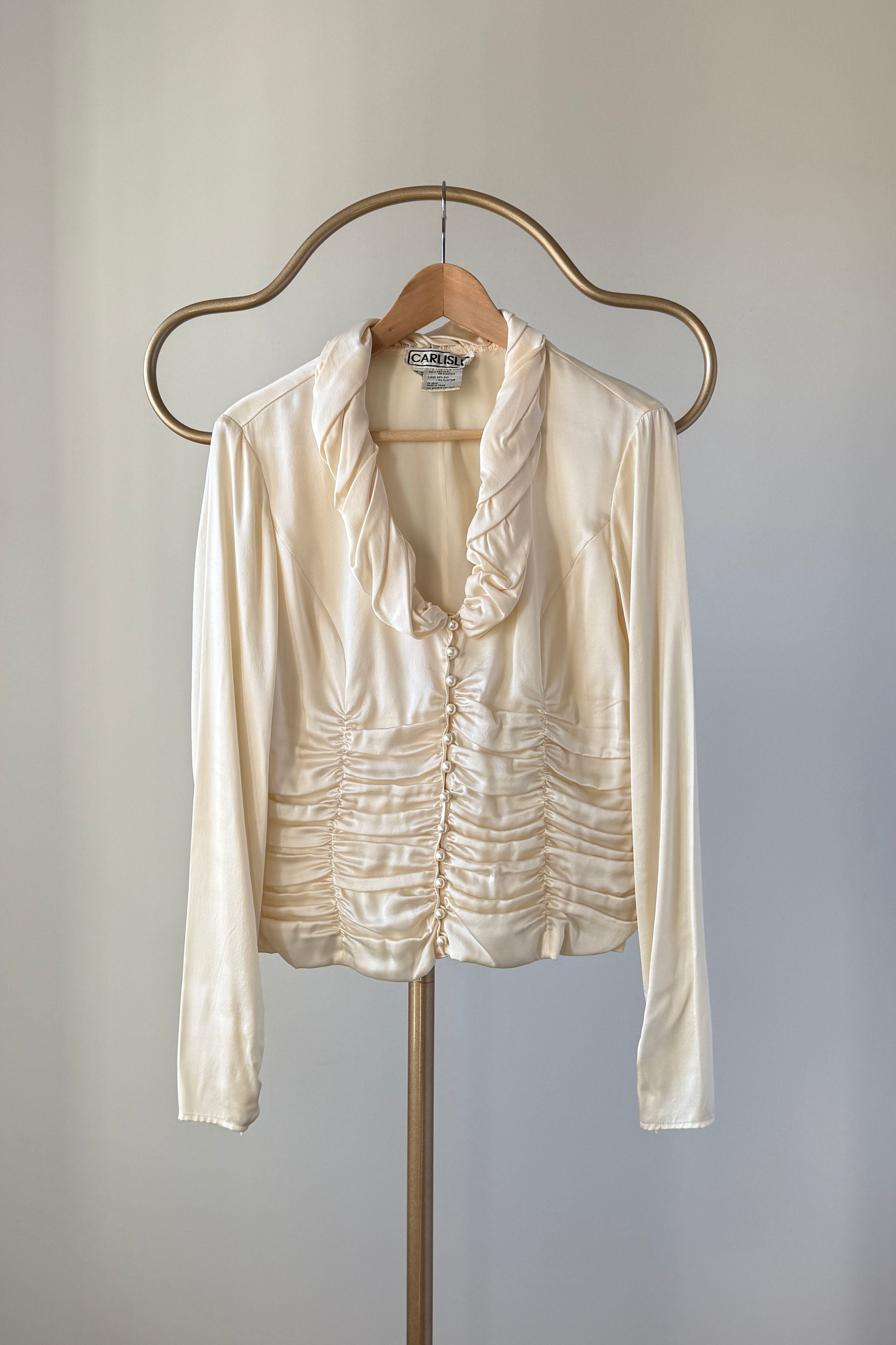 VINTAGE SILK BLOUSEVintage 1980s ivory silk blouse. Ruched waist + collar, covered button closure, zippers at each wrist. By Carlisle.Excellent condition. Fits like large.Length 22Shoulder 17Sleeve 22Bust 40-42Waist 32As with all vintage, please expect wear consistent with age. All sales are final. No order cancellations.0777 | 2603