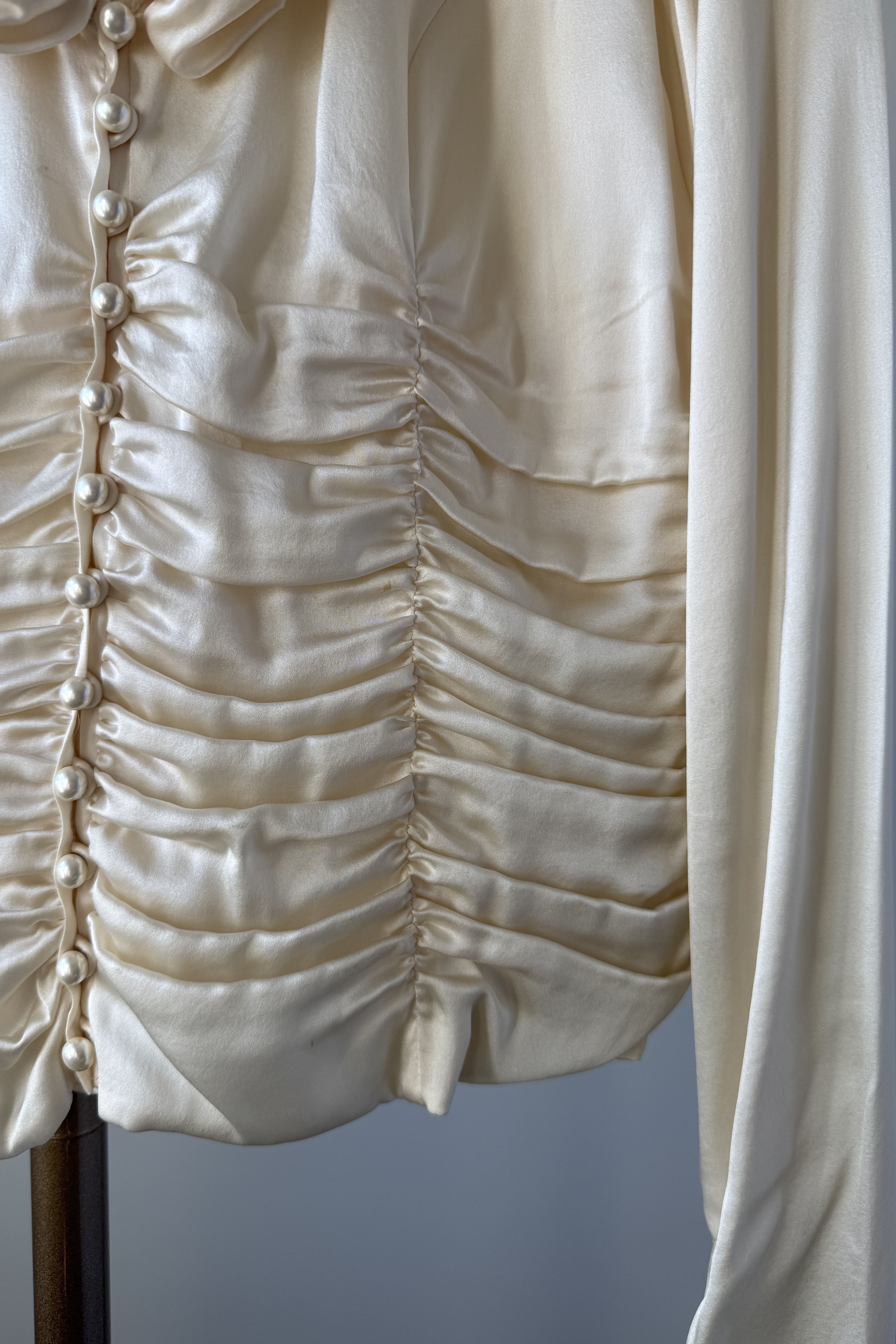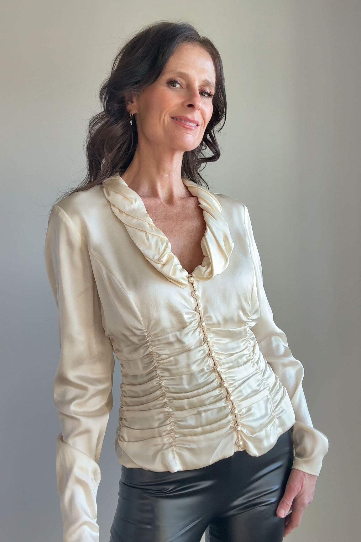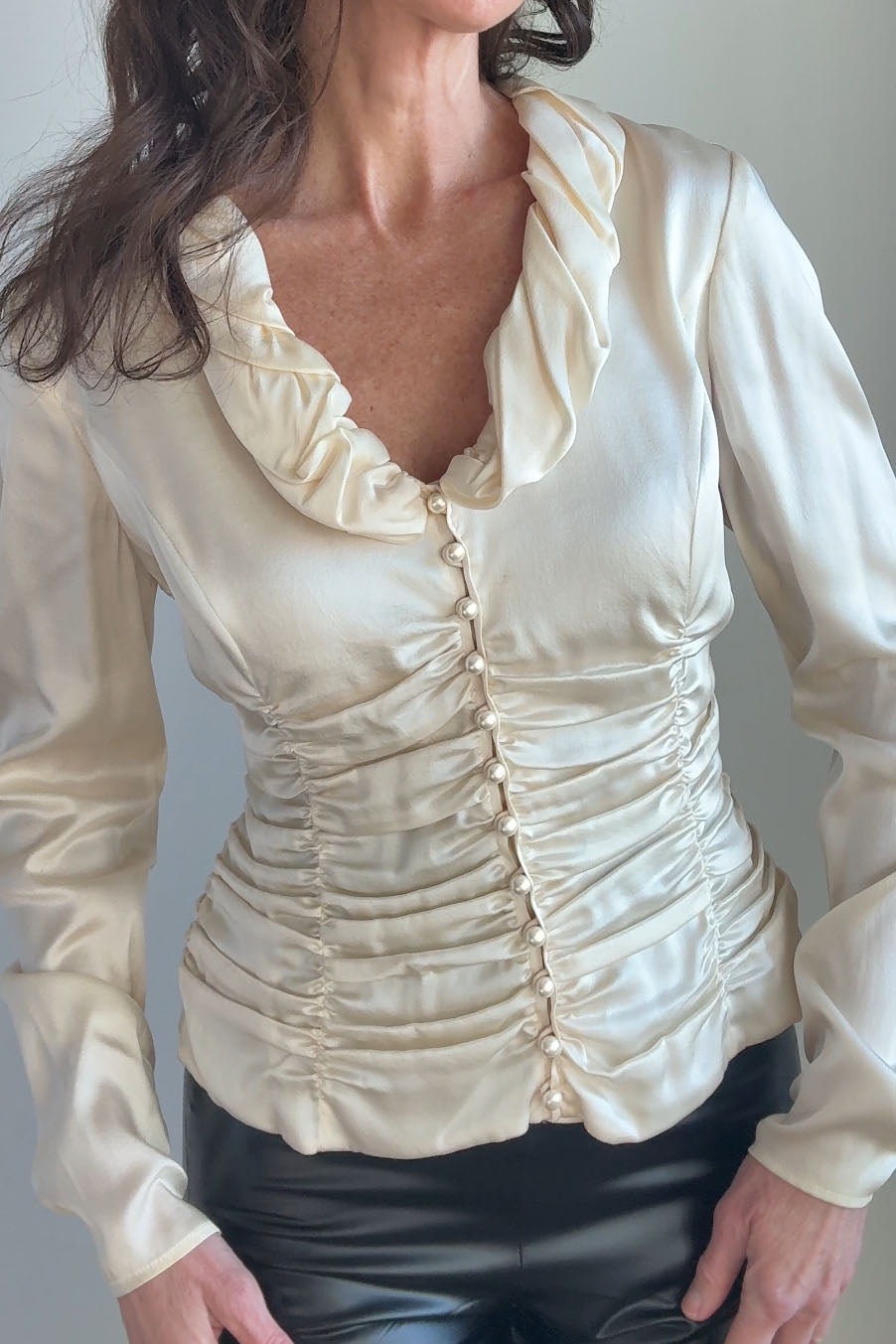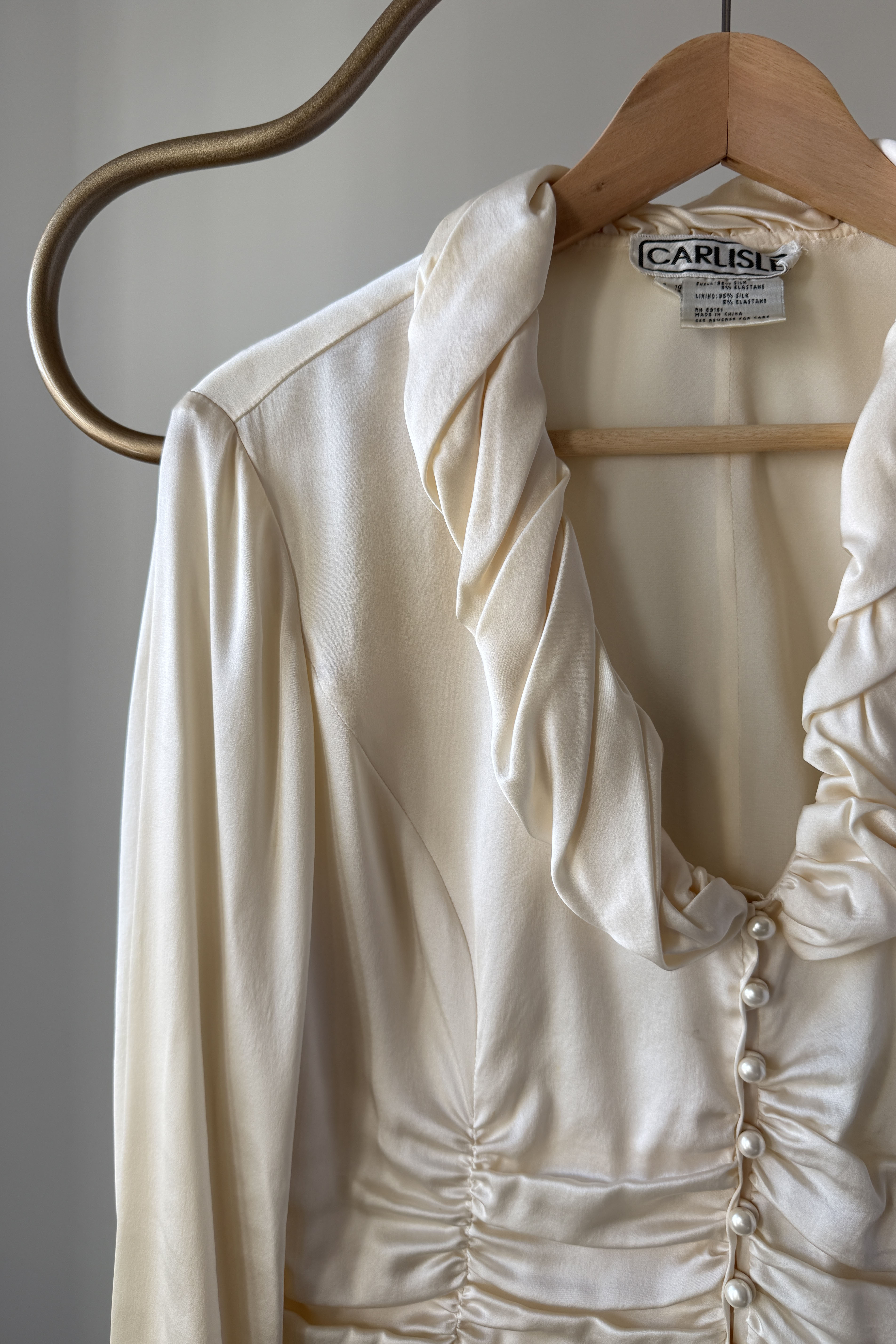 VINTAGE SILK BLOUSEVintage 1980s ivory silk blouse. Ruched waist + collar, covered button closure, zippers at each wrist. By Carlisle.Excellent condition. Fits like large.Length 22Shoulder 17Sleeve 22Bust 40-42Waist 32As with all vintage, please expect wear consistent with age. All sales are final. No order cancellations.0777 | 2603