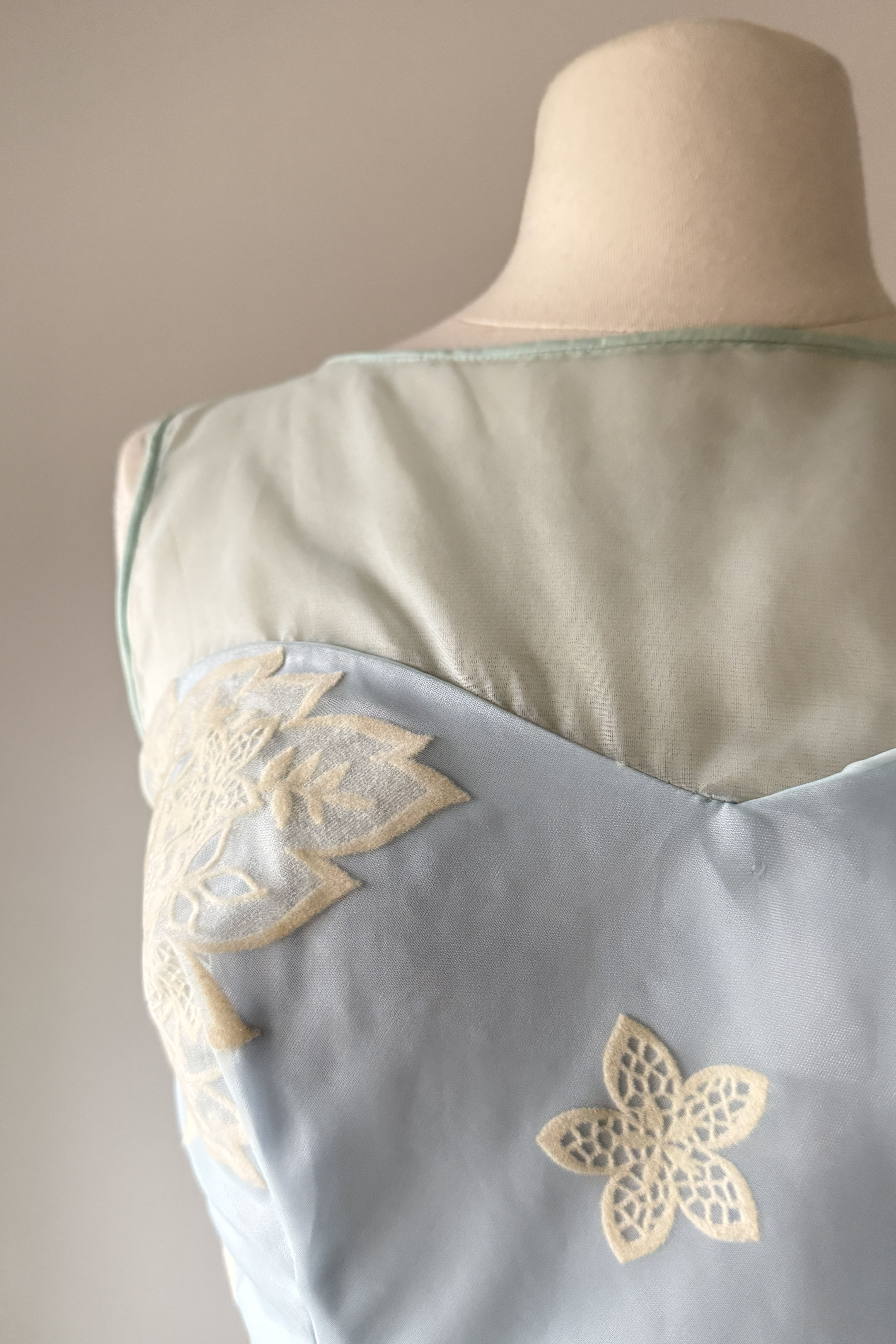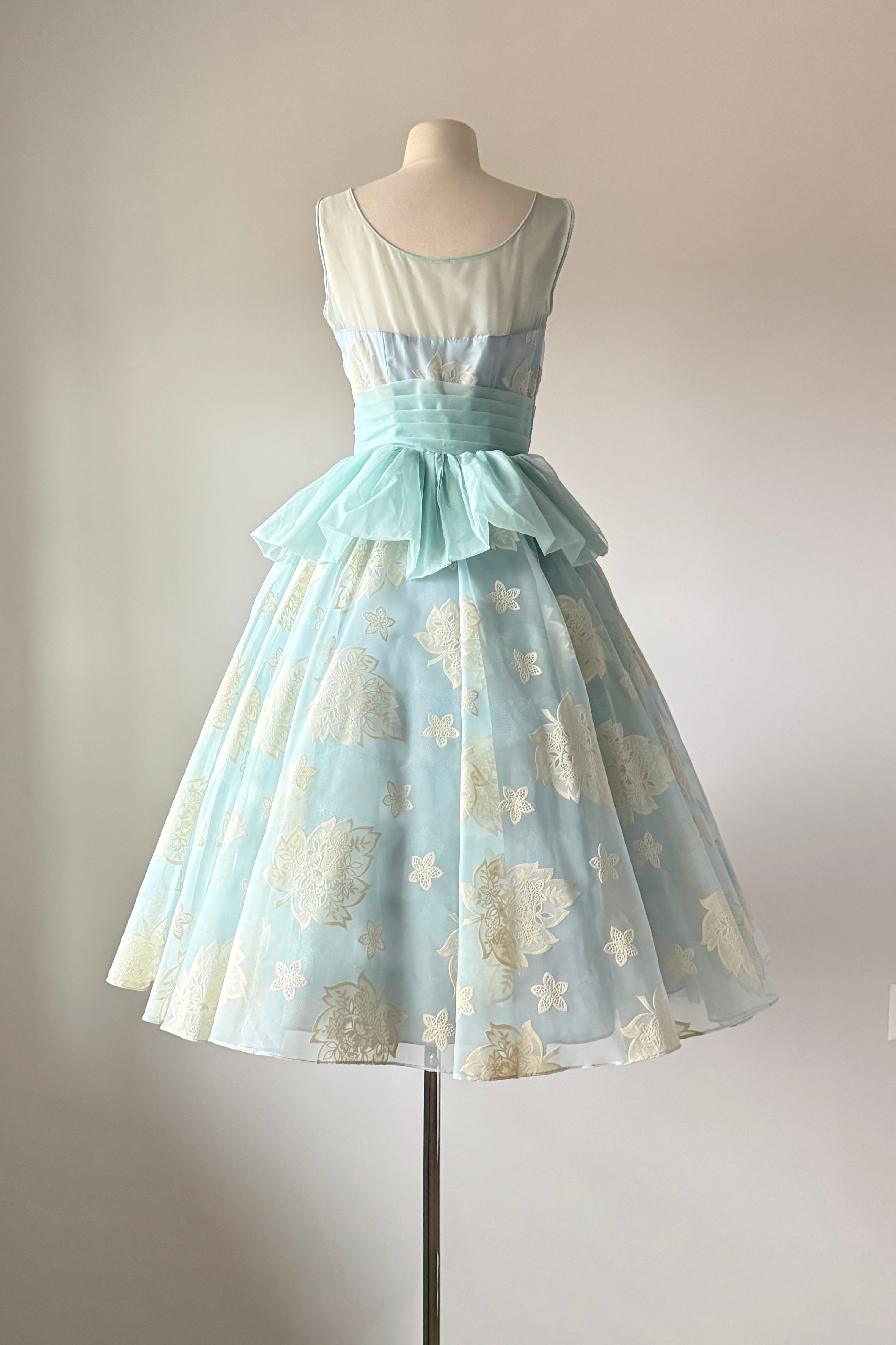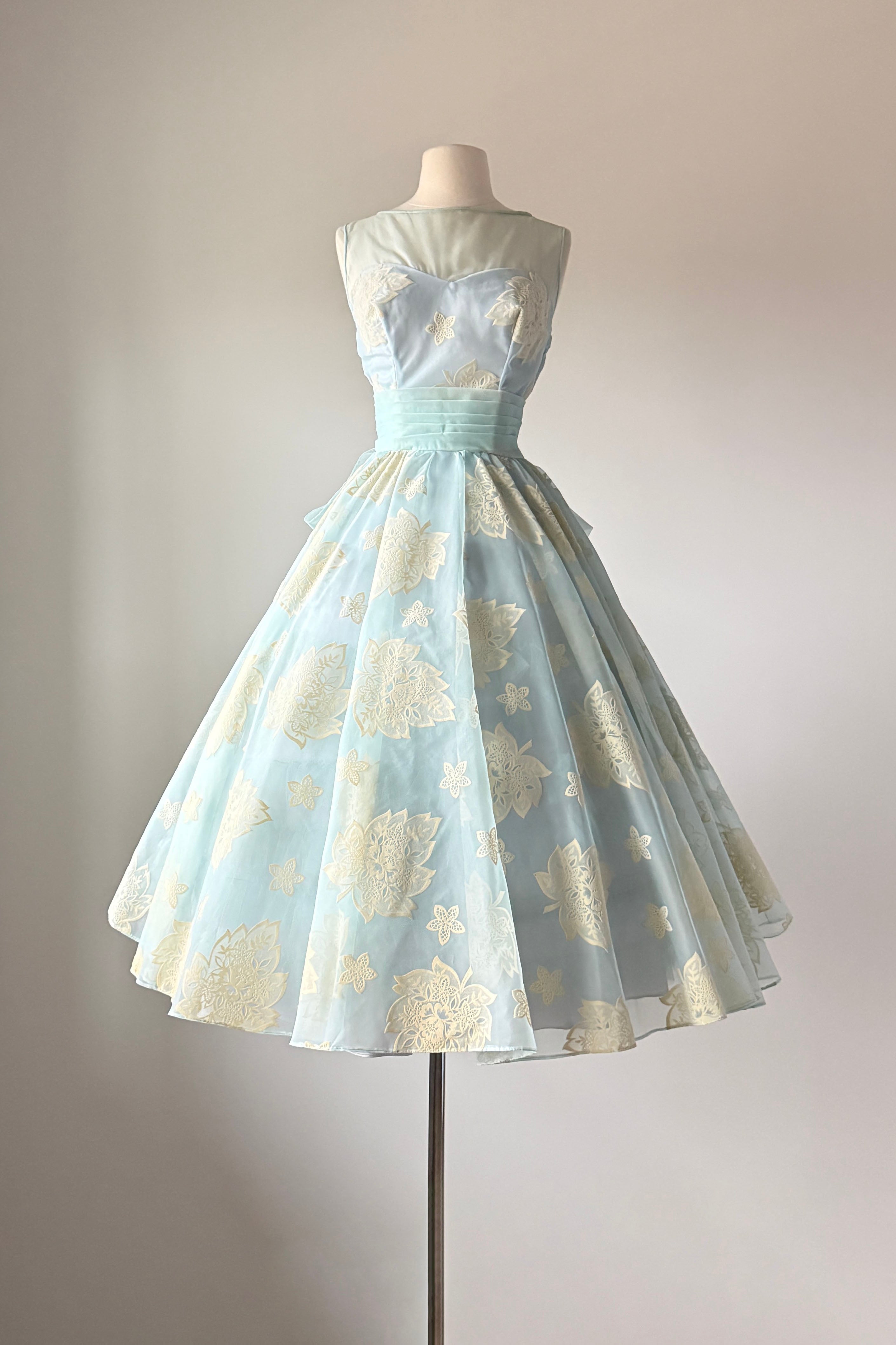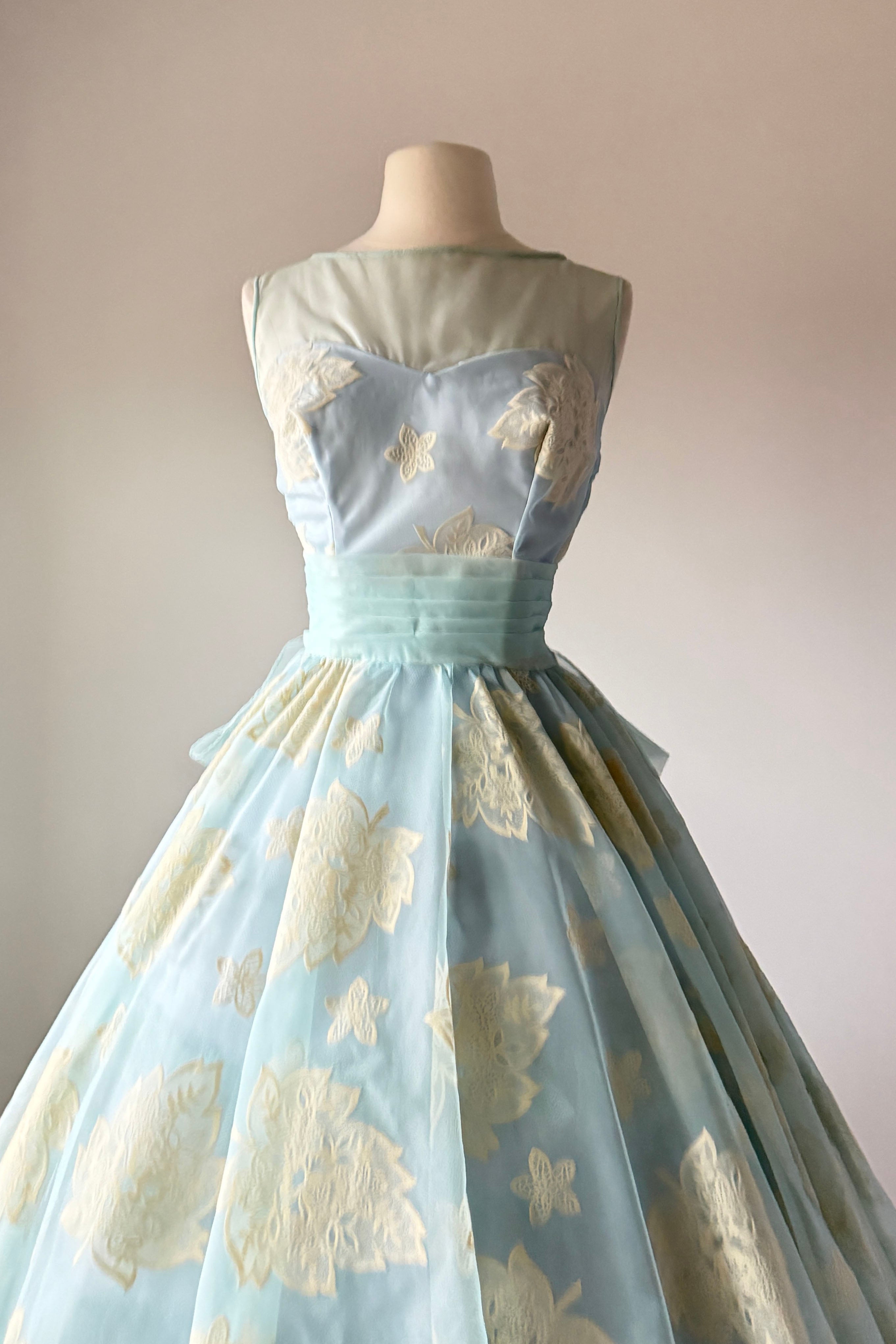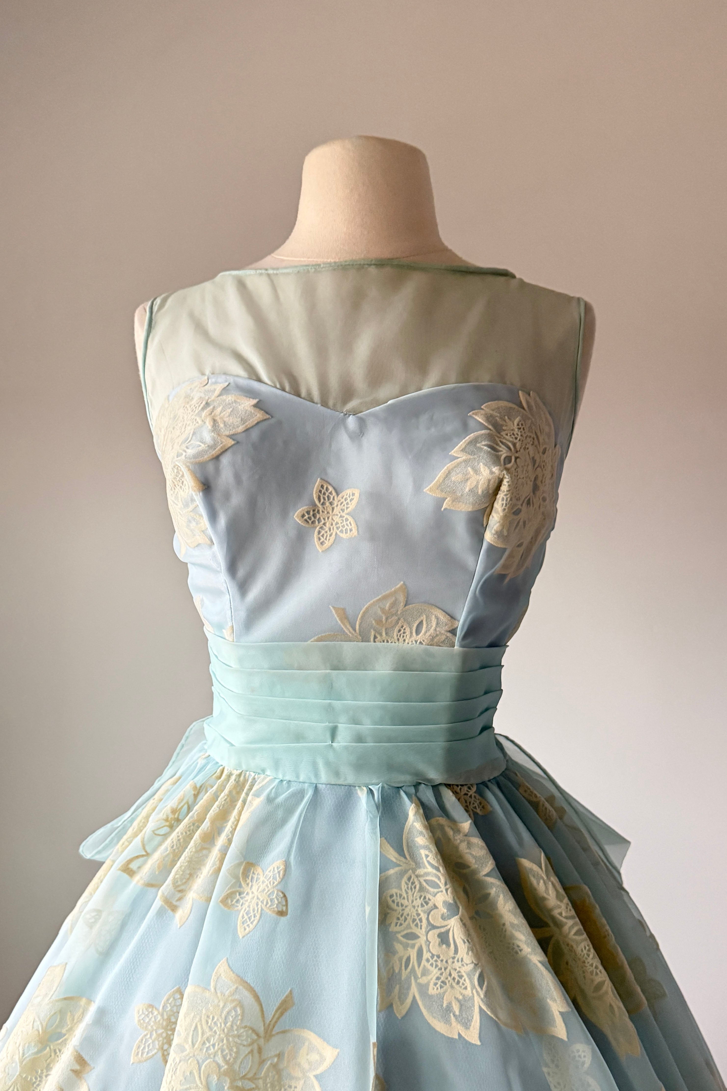 VINTAGE DRESSVintage 1950s dress. Features powder blue chiffon, illusion bodice, fuzzy flocked floral pattern, acetate and tulle linings, metal side zipper.Excellent condition. A few tiny spots on flocking and faint pink smudge on waist. Crisp and appears have never been worn.MEDIUM. Length 48Bodice 16Bust 36-37Waist 28-29As with all vintage, please expect wear consistent with age. All sales are final. No order cancellations.0861 | 2608