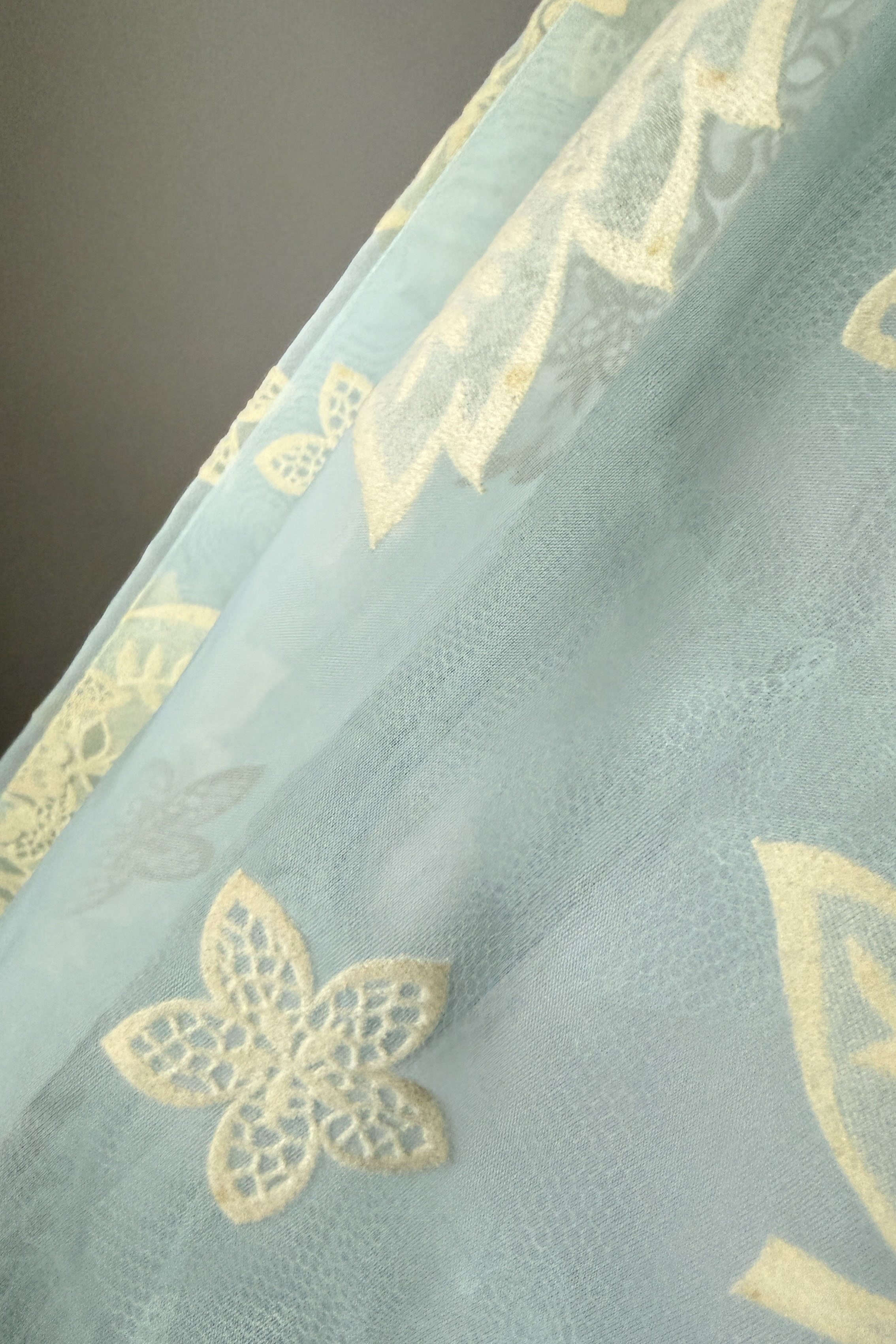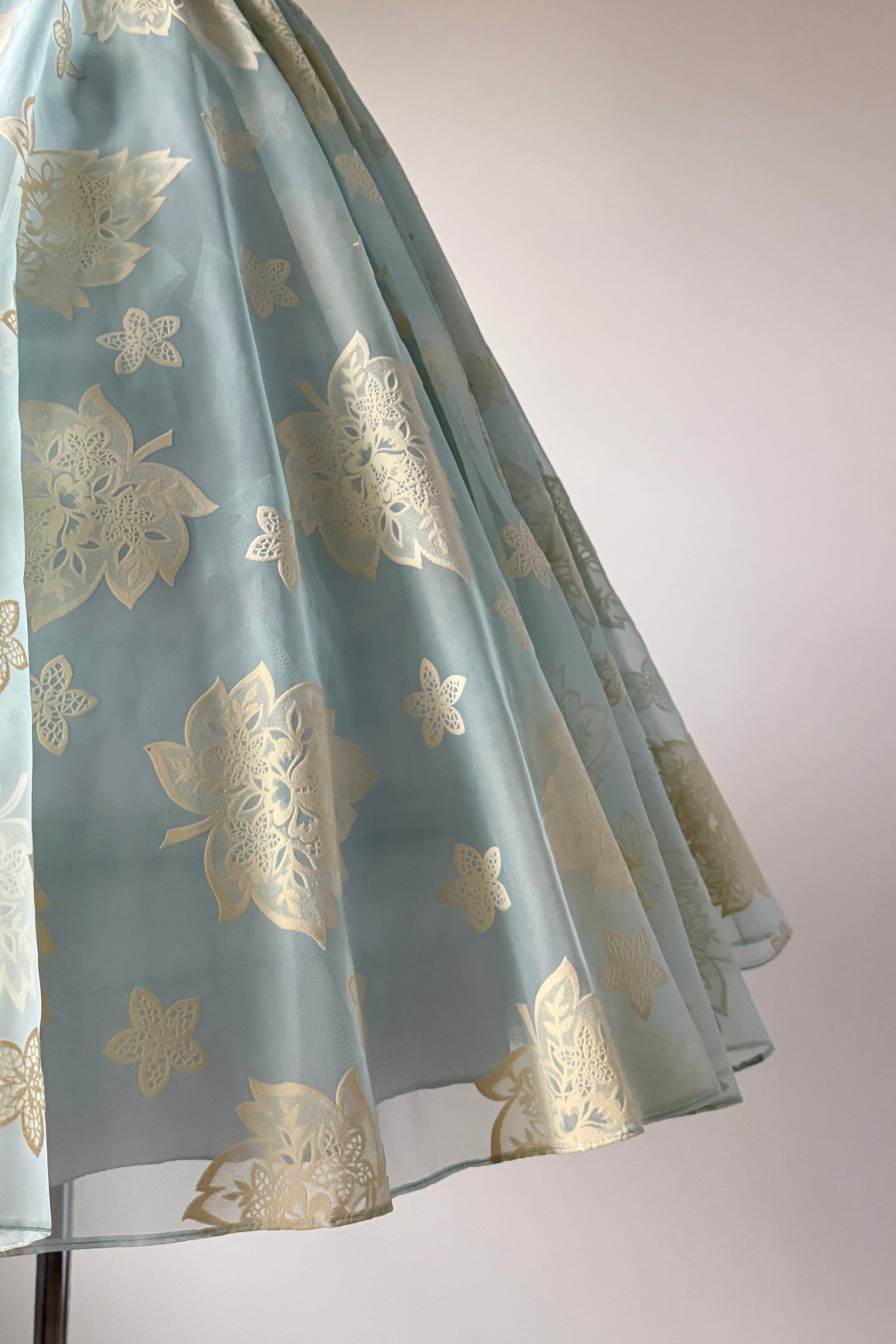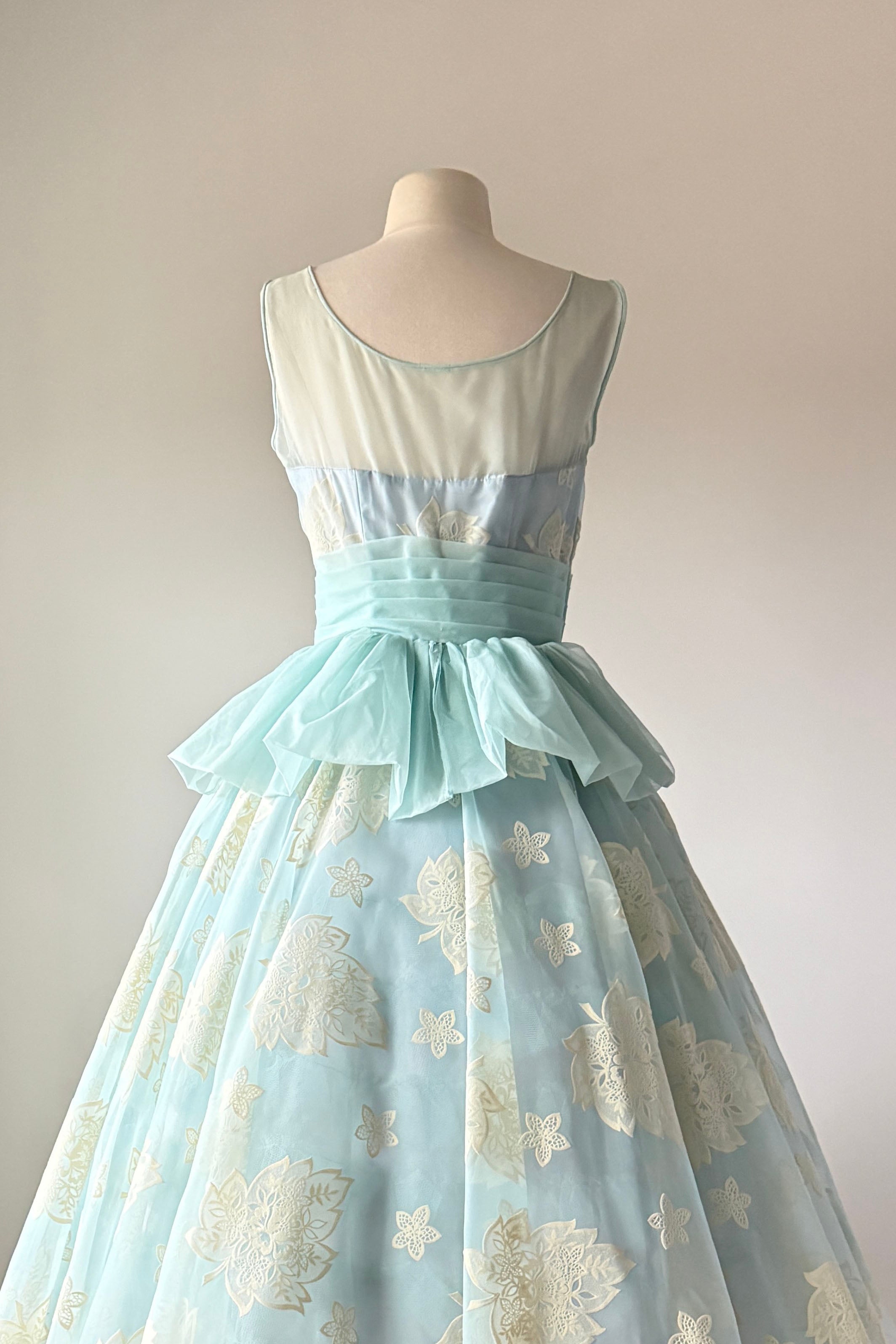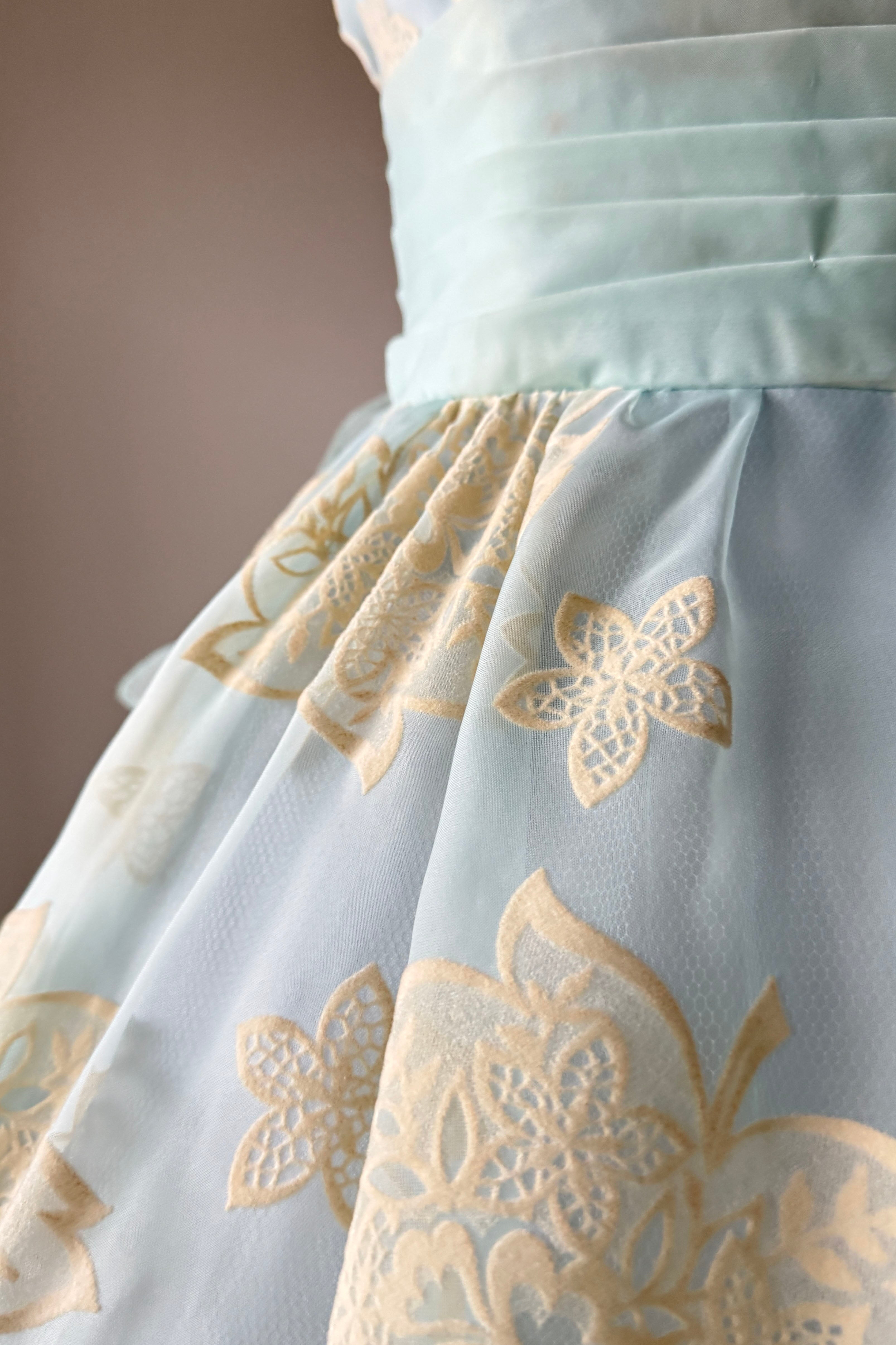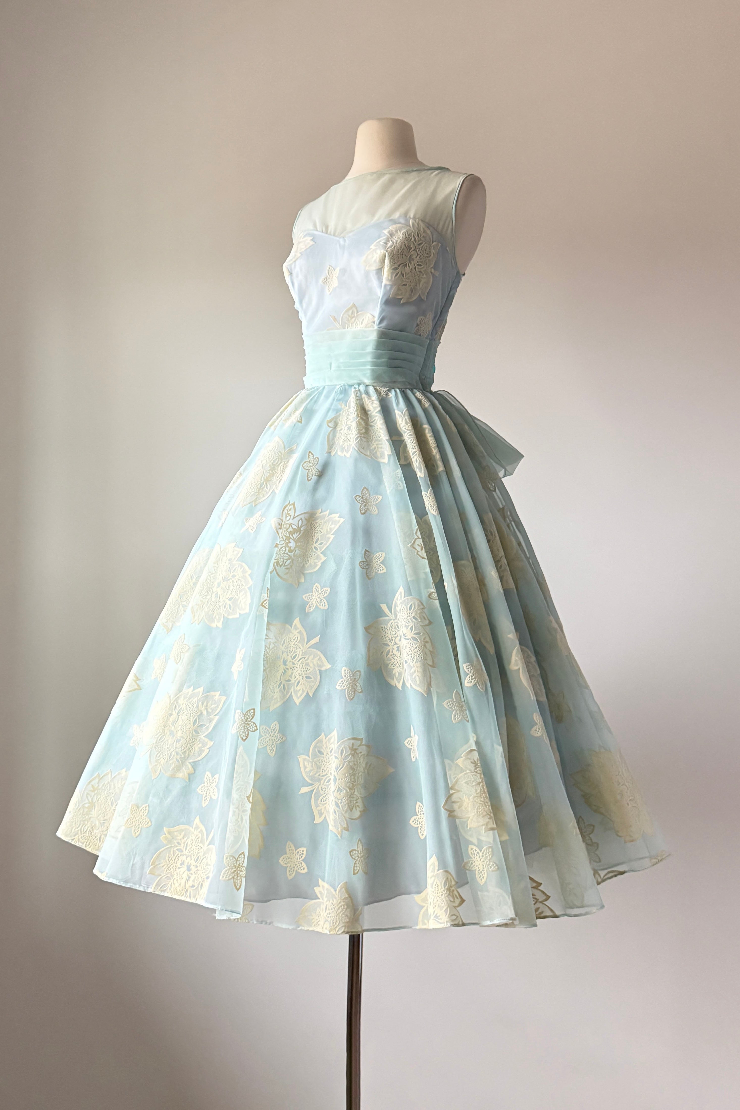 VINTAGE DRESSVintage 1950s dress. Features powder blue chiffon, illusion bodice, fuzzy flocked floral pattern, acetate and tulle linings, metal side zipper.Excellent condition. A few tiny spots on flocking and faint pink smudge on waist. Crisp and appears have never been worn.MEDIUM. Length 48Bodice 16Bust 36-37Waist 28-29As with all vintage, please expect wear consistent with age. All sales are final. No order cancellations.0861 | 2608