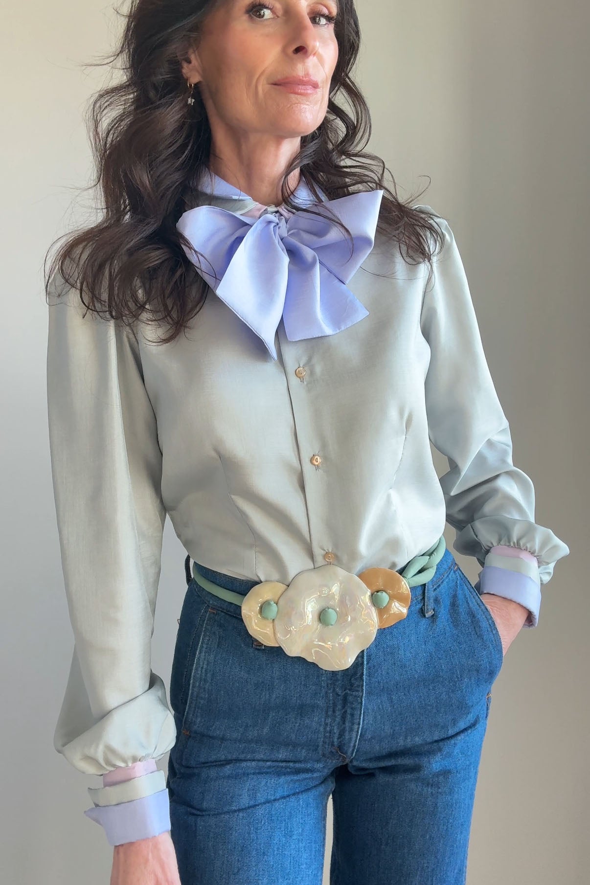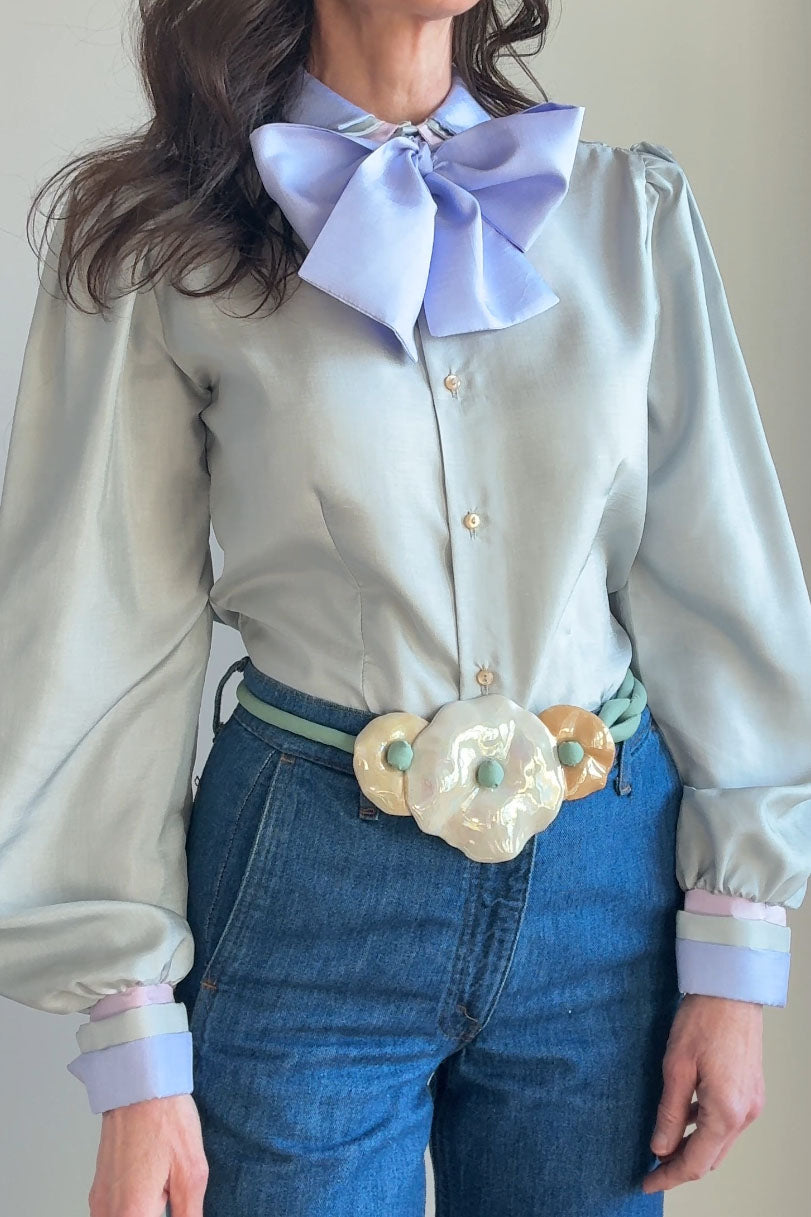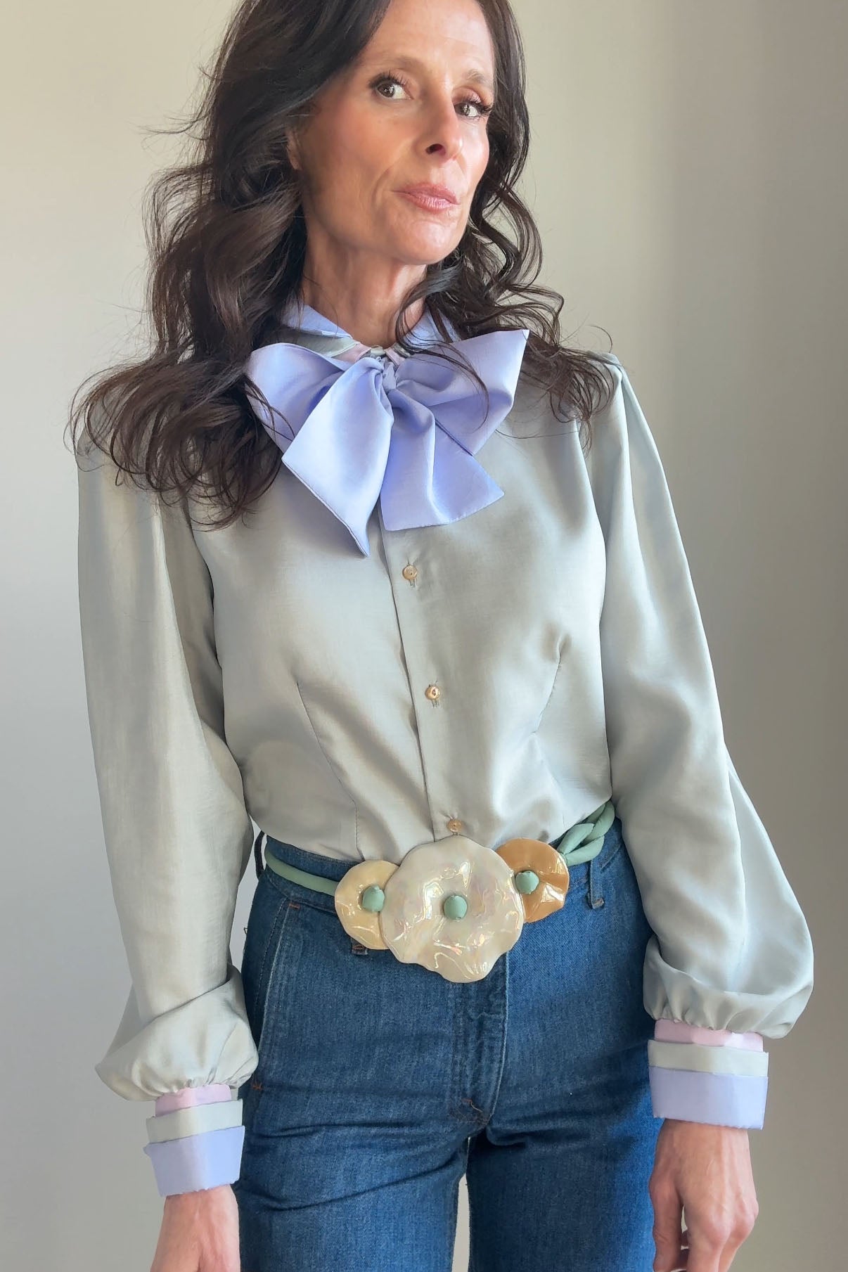 VINTAGE BLOUSEVintage 1980s triple collar bow tie blouse. Dead stock with tags. Poly. By Stitches by Marjorie de Martino.Excellent condition. Fits like s/m.Length 27Shoulder 15Sleeve 26Bust 39As with all vintage, please expect wear consistent with age. All sales are final. No order cancellations.0793 | 2603