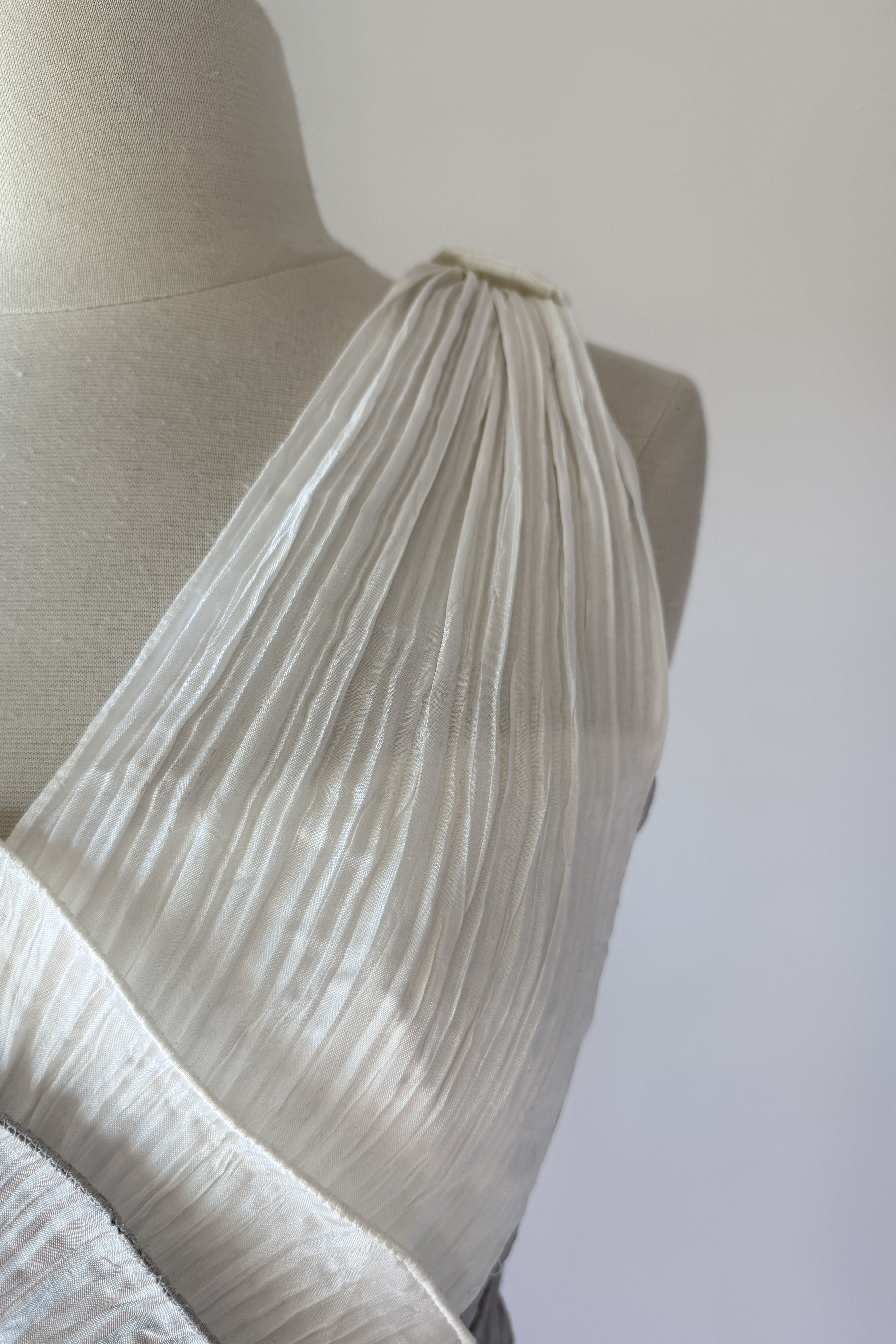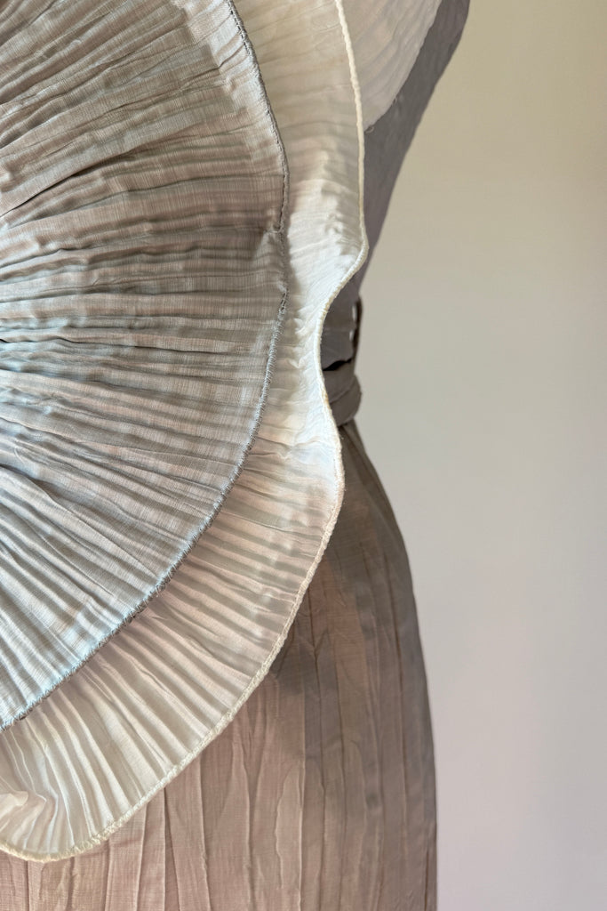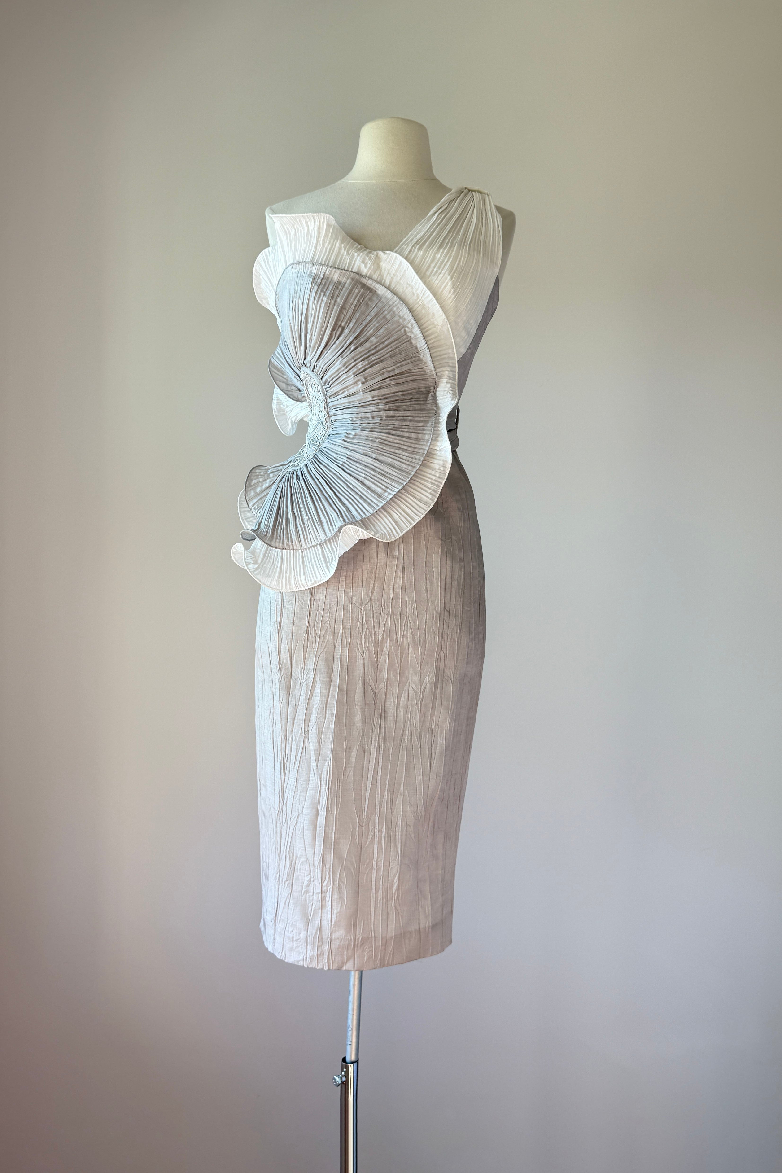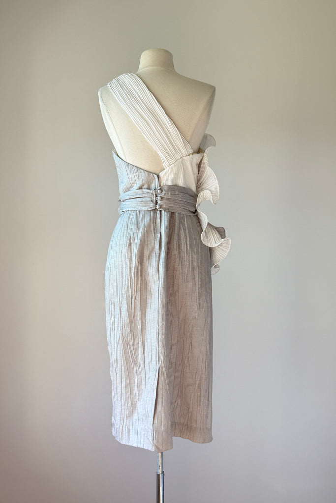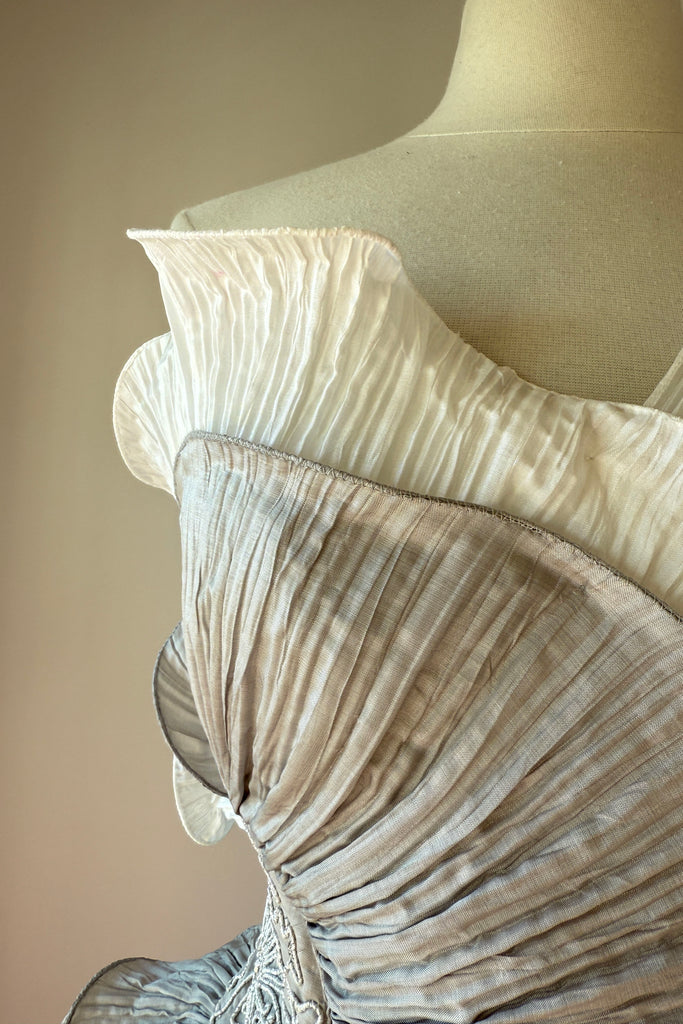 VINTAGE ORIGAMI RUFFLE DRESS1980s white and oyester gray pleated origami ruffle dress. Soutache + rhinestones at right waist, back zipper, acetate lined bodice. Polyester. By B.B. Collection.Excellent condition. Fits like SMALLLength 45Bodice 17Bust 34Waist 27Hip 40As with all vintage, please expect wear consistent with age. All sales are final. No order cancellations.0684 | 2545