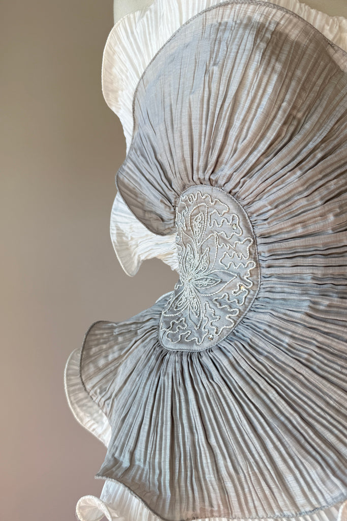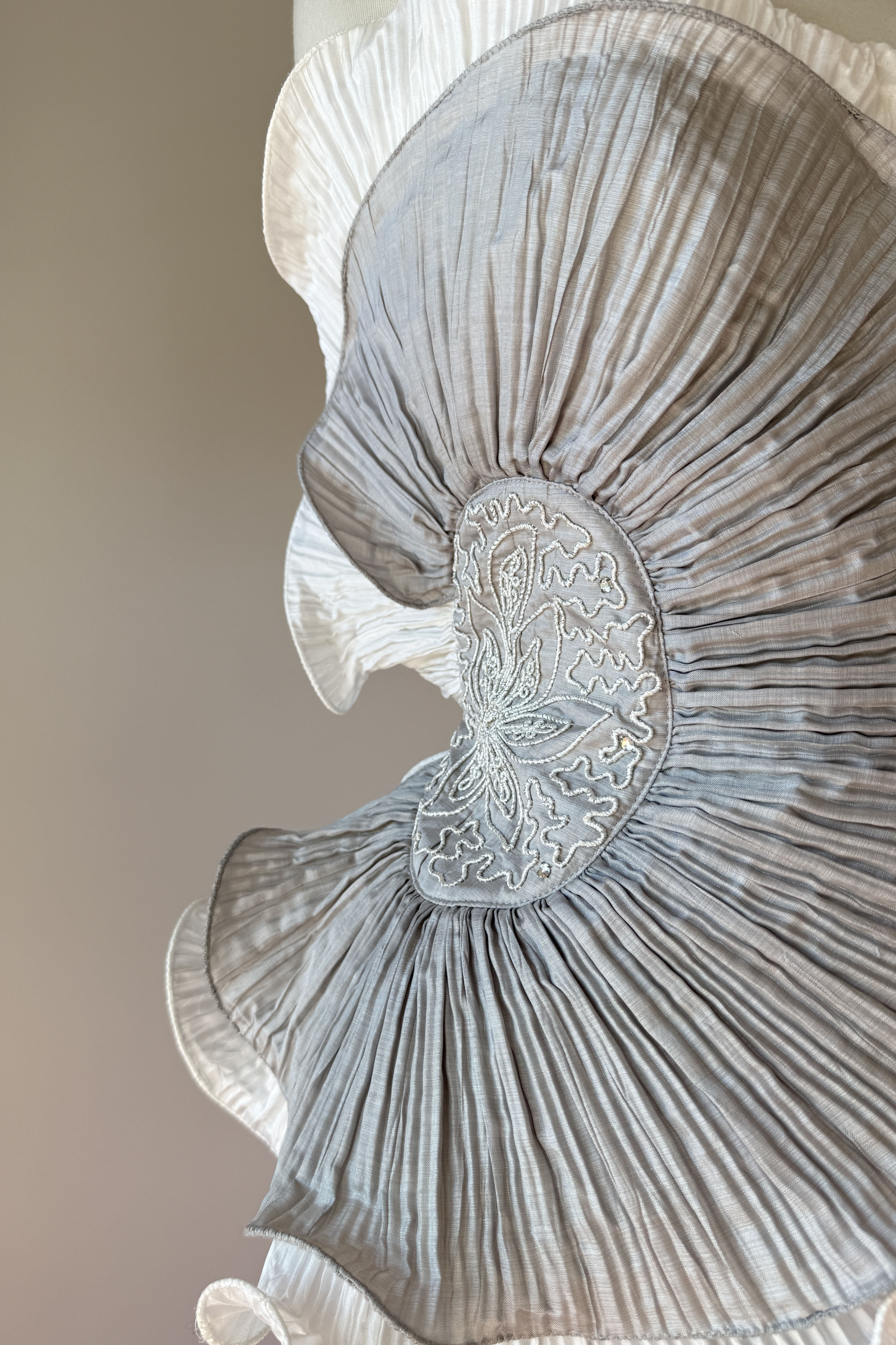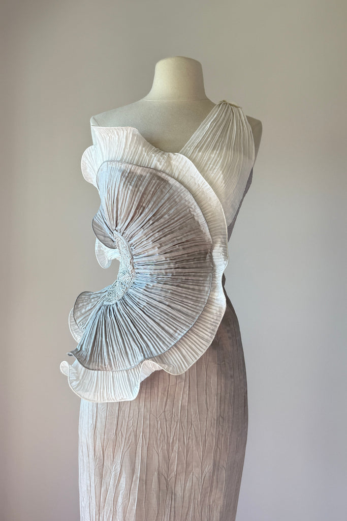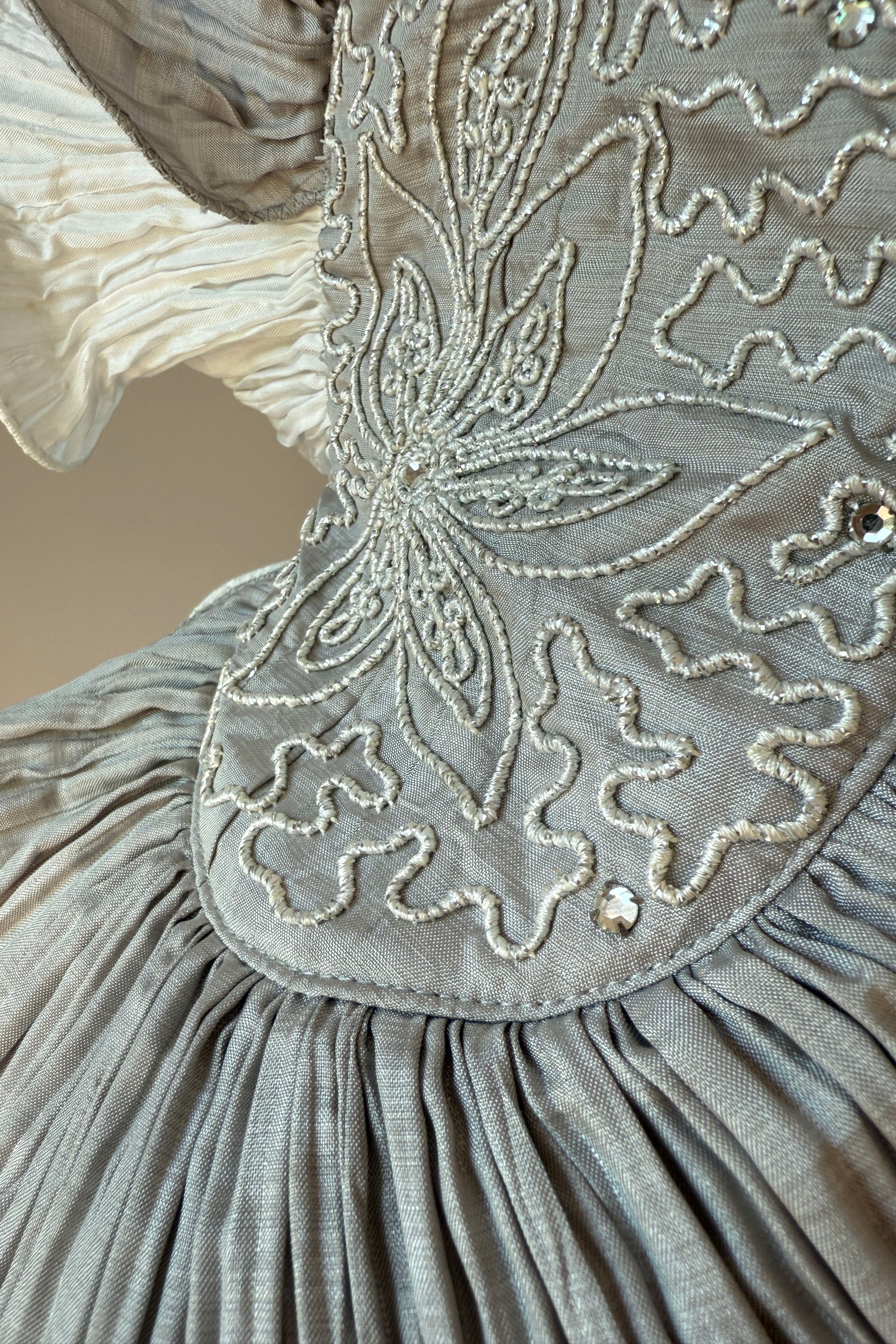 VINTAGE ORIGAMI RUFFLE DRESS1980s white and oyester gray pleated origami ruffle dress. Soutache + rhinestones at right waist, back zipper, acetate lined bodice. Polyester. By B.B. Collection.Excellent condition. Fits like SMALLLength 45Bodice 17Bust 34Waist 27Hip 40As with all vintage, please expect wear consistent with age. All sales are final. No order cancellations.0684 | 2545